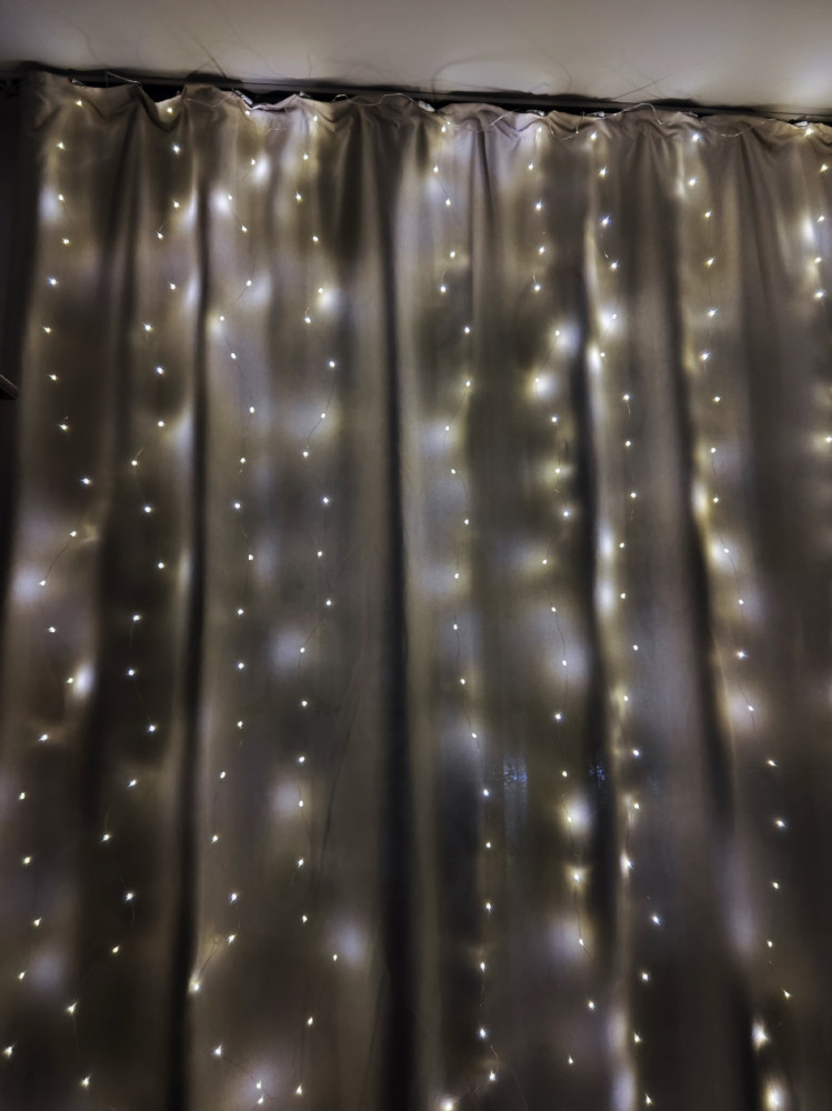 Хорошая гирлянда. Удобно, что на крючках. Нити гирлянды тонкие, цвет свечения теплый. Есть пульт управления.