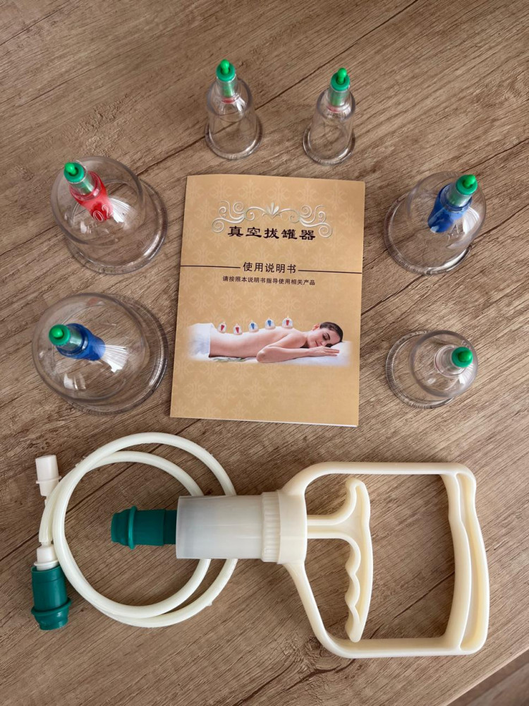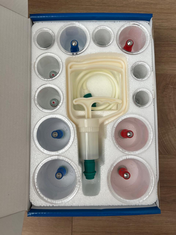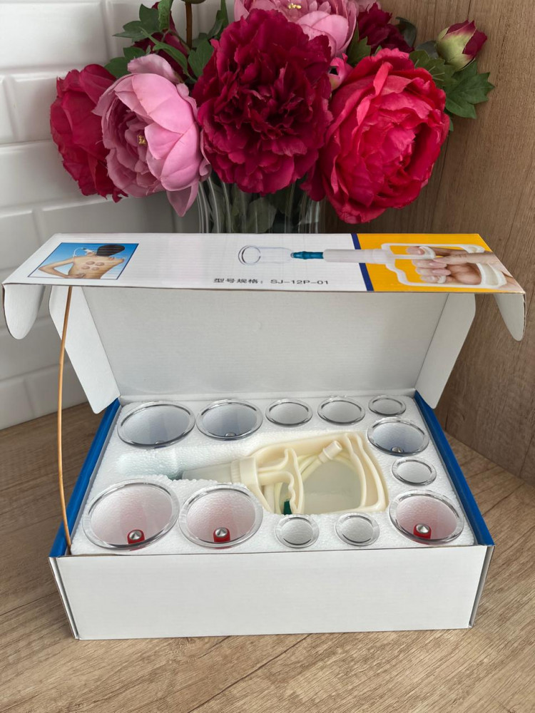 • 12 вакуумных массажных банок (размеры: 29 мм — 2 шт, 38 мм — 2 шт, 42 мм — 2 шт, 51 мм — 2 шт, 60 мм — 2 шт, 68 мм — 2 шт);