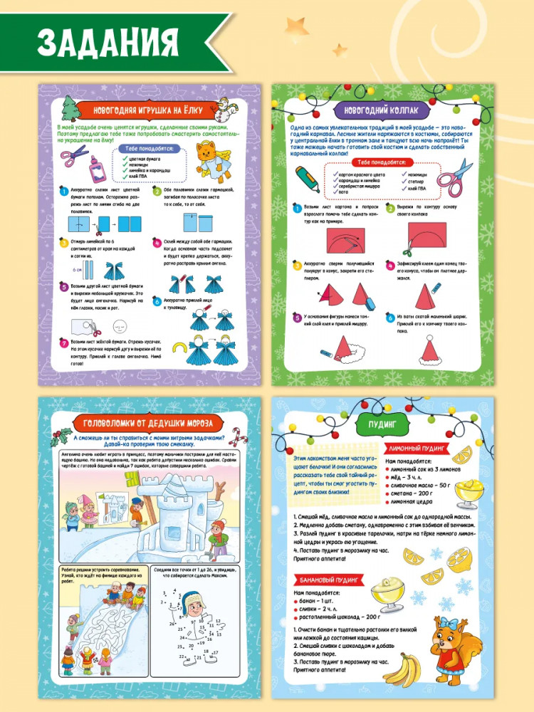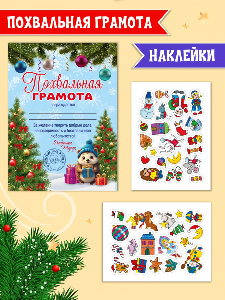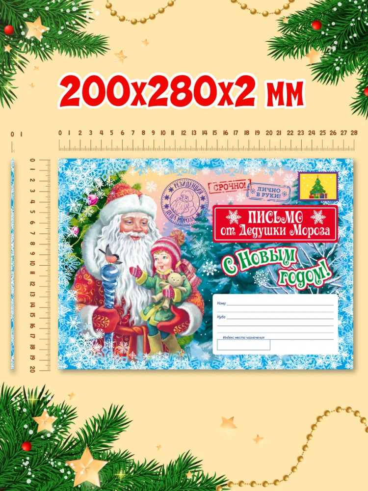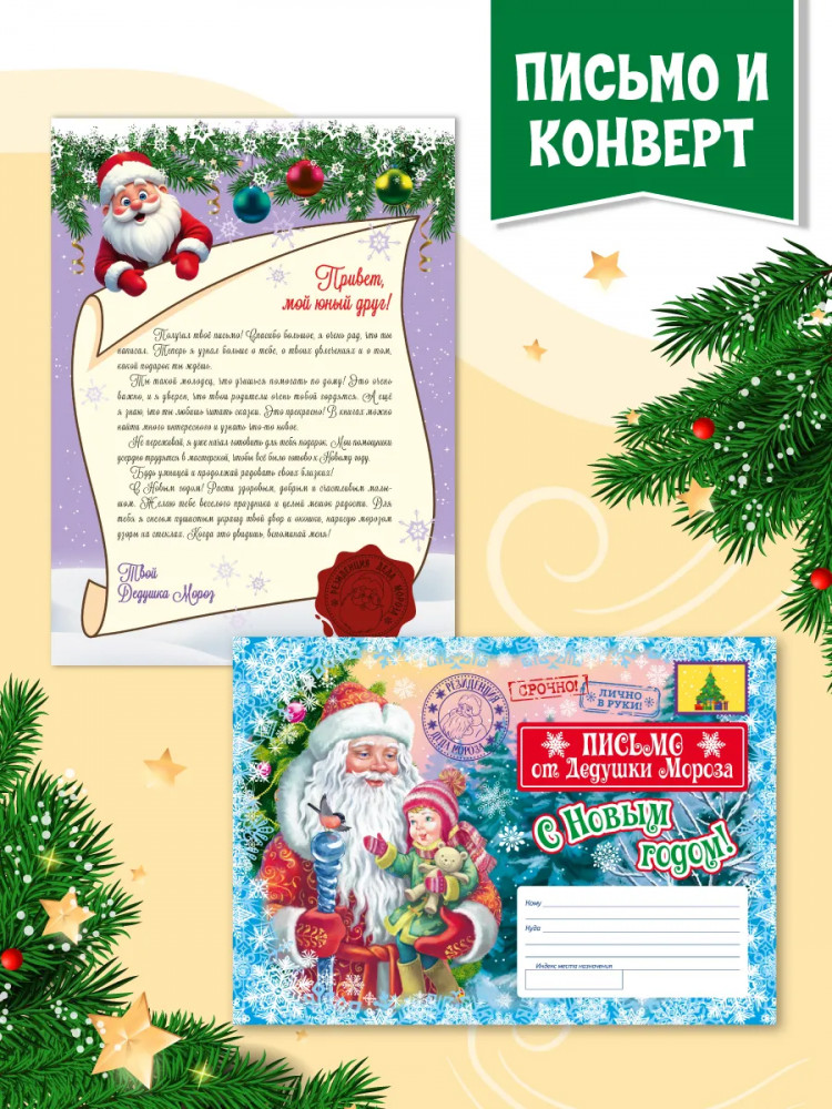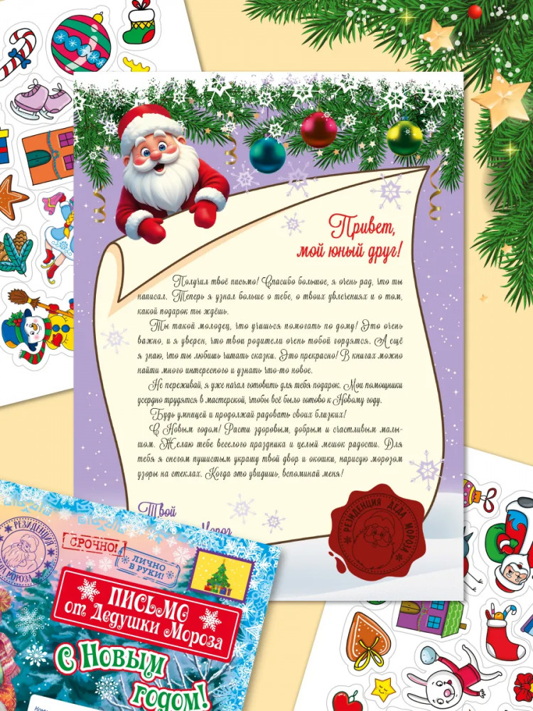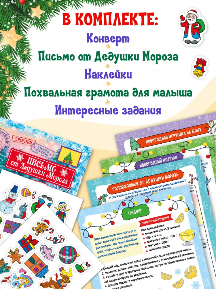 «Письмо от Деде Мороза» — подарочный набор, который принесёт радость ребёнку и оставит тёплые воспоминания о празднике на долгие годы. В красиво оформленном конверте находится личное письмо от Деда Мороза с тёплыми словами и поздравлениями, почётная грамота за хорошее поведение, где можно вписать или напечатать имя ребенка; а также листы с заданиями от зимнего волшебника: новогодний рецепт, поделки и увлекательные головоломки. В подарок к набору прилагаются новогодние наклейки. |