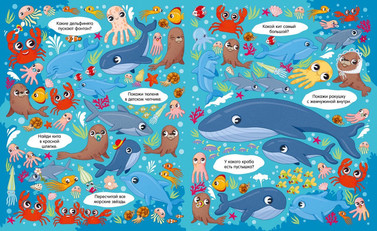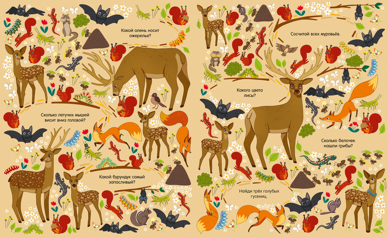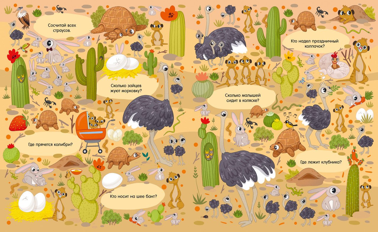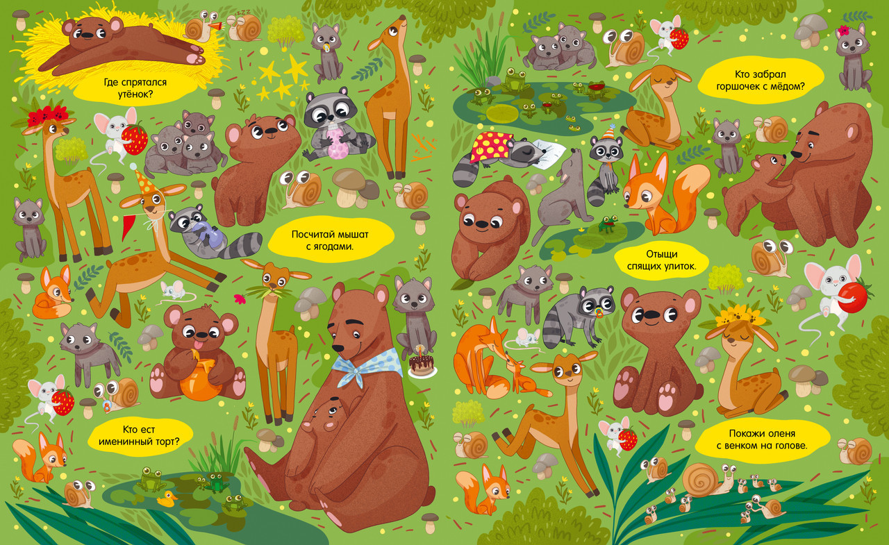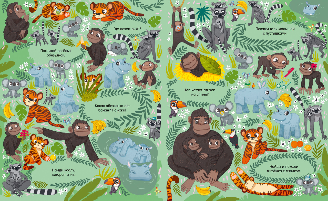 Серия: Найди и покажи В этой красочной книге есть все, что так любят дети: много забавных картинок, милые персонажи и любимая игра на поиск предметов. На каждом развороте ждет новая локация, новые мини-сюжеты на картинках и новые животные. Разглядывайте иллюстрации вместе с малышом и выполняйте интересные задания: сосчитать цыплят и овечек, найти обезьянку с бананом или спящую коалу. Книга познакомит ребенка с разными животными и их детенышами, поможет выучить новые слова и потренировать внимательность. Книга увлечет малыша надолго и подарит вам много интересных часов за совместными играми. |