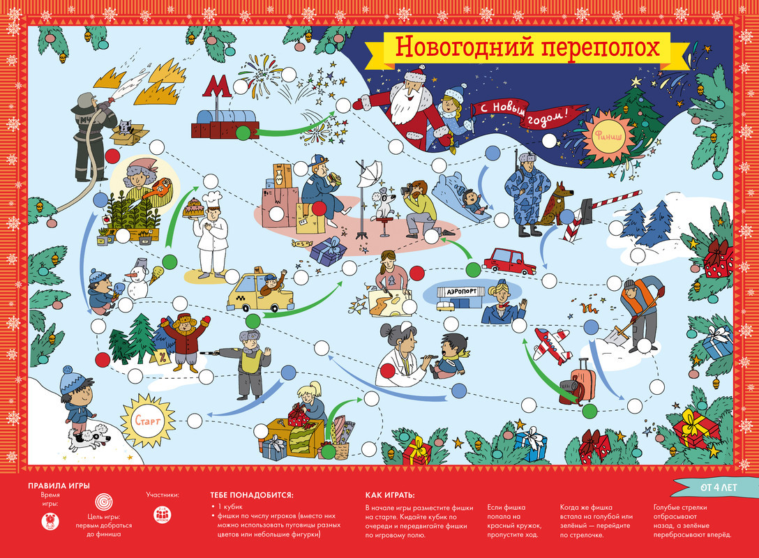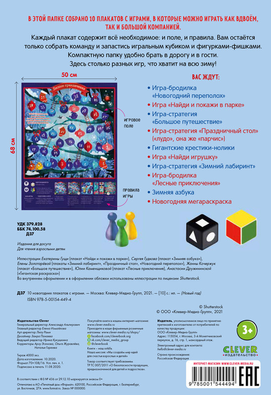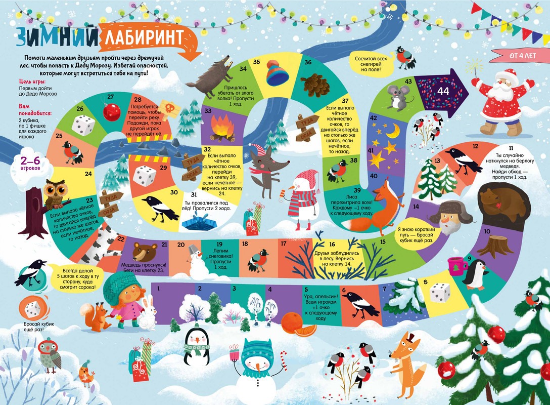 10 новогодних плакатов с играминовинка В данный момент этот товар отсутствует в продаже. Возможно, у нас найдется аналогичный или похожий товар здесь. «10 новогодних плакатов с играми» содержат игры, в которые можно играть как вдвоем, так и большой компанией. Каждый плакат размером 50×70 см содержит все необходимое — и поле, и правила. Вам останется только собрать команду и запастись игральным кубиком и фигурками-фишками. А компактную папку удобно брать в дорогу и в гости. В комплекте «10 новогодних плакатов с играми» столько разных игр, что хватит на всю зиму! Вас ждут: бродилка «Новогодний переполох» и «Найди и покажи в парке», игра-стратегия «Большое путешествие» и «Праздничный стол», гигантские крестики-нолики, игра «Найди игрушку», игра-стратегия «Зимний лабиринт», бродилка «Лесные приключения», «Зимняя азбука», «Новогодняя мегараскраска». |