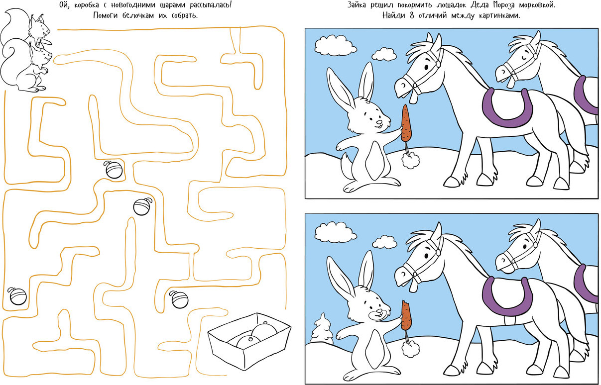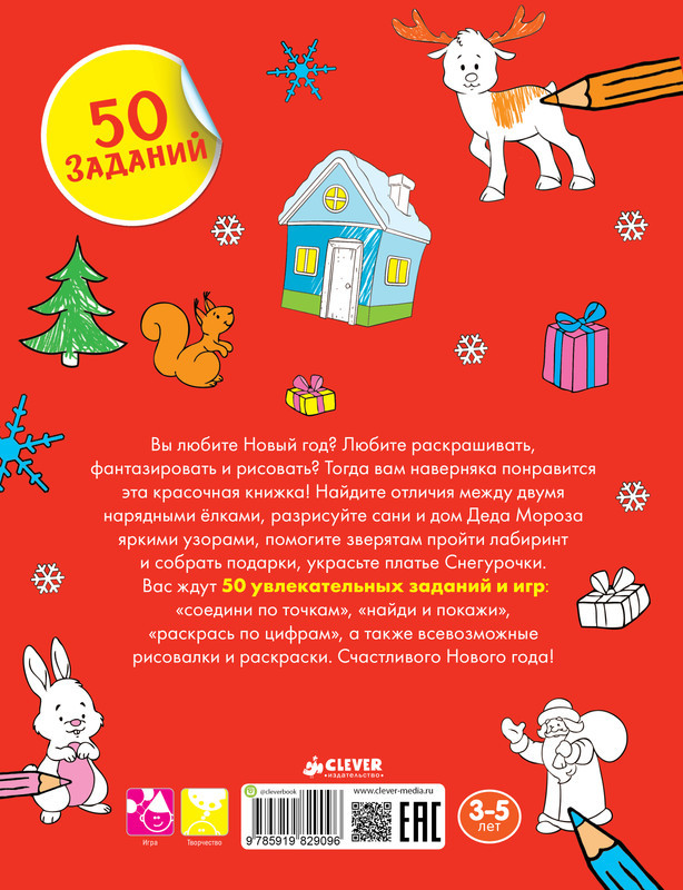 50 самых разных заданий на развитие мелкой моторики, логического мышления, внимания, памяти, популярные игры «найди и покажи», «соедини точки», «раскрась по цифрам», «найди сходства и различия», раскраски и рисовалки для тех, кто хочет обучаться рисованию, волшебные, новогодние, веселые задания для тех, кто обожает Деда Мороза и Снегурочку, снеговика, сказки и зимние праздники!