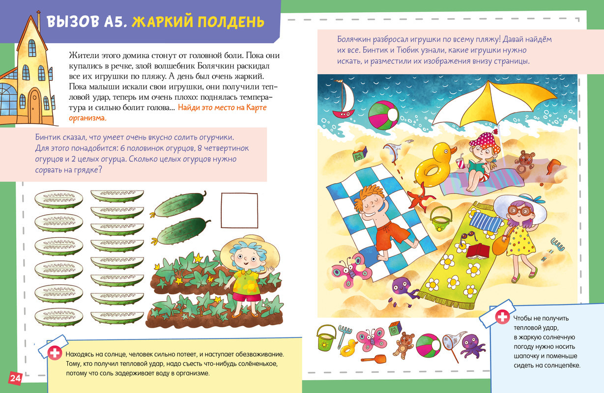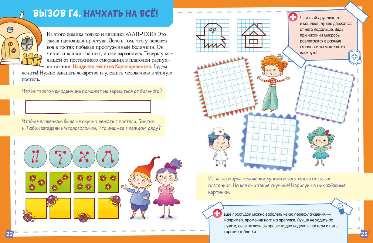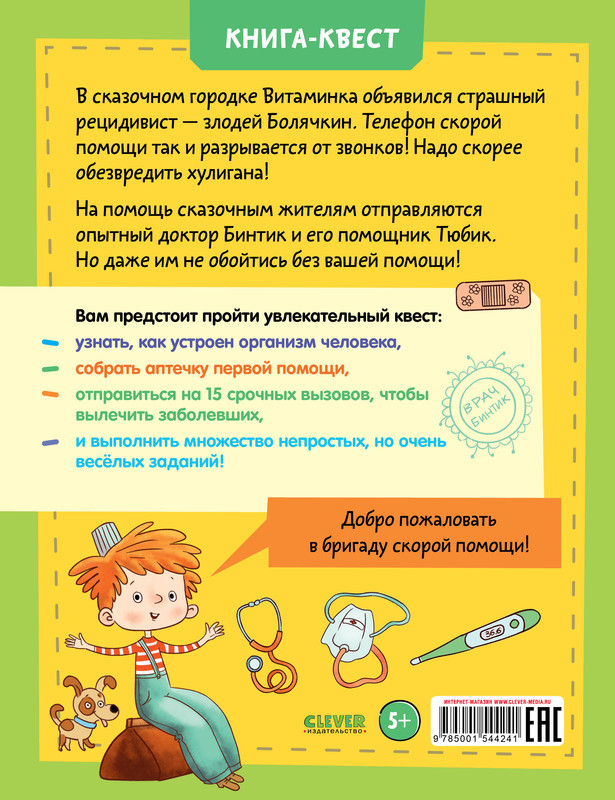 Серия: Книга-квест Эта книга — квест для детей, которые любят играть в доктора. Вас ждет увлекательная история для самостоятельного чтения и 15 запутанных медицинских случаев, а также интересные задания для развития логики, внимания, памяти: лабиринты, раскраски, найди и покажи. Помогая героям, ребенок не только познакомится с профессией врача и анатомией, но и перестанет бояться уколов и посещения больницы. |