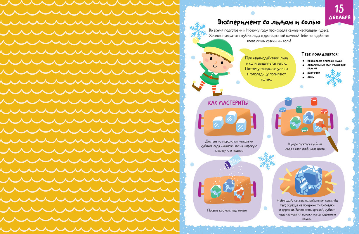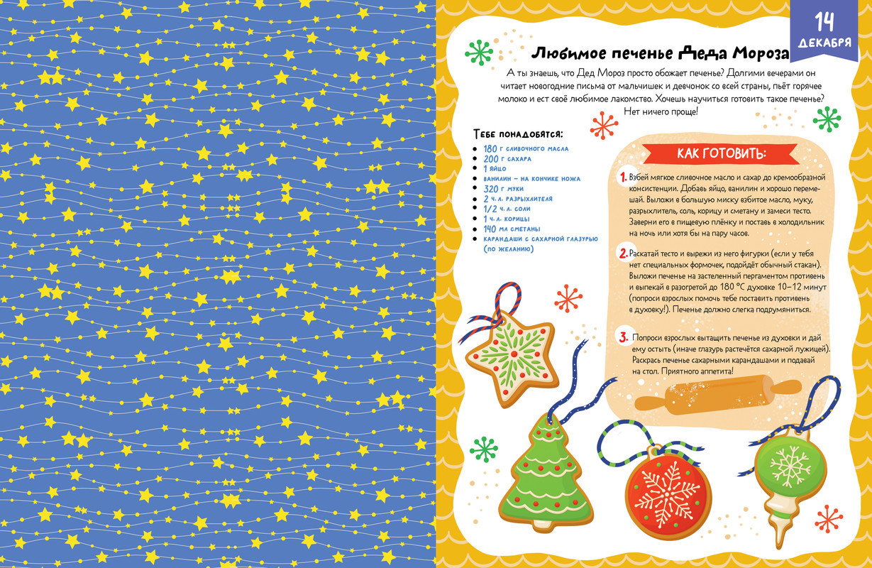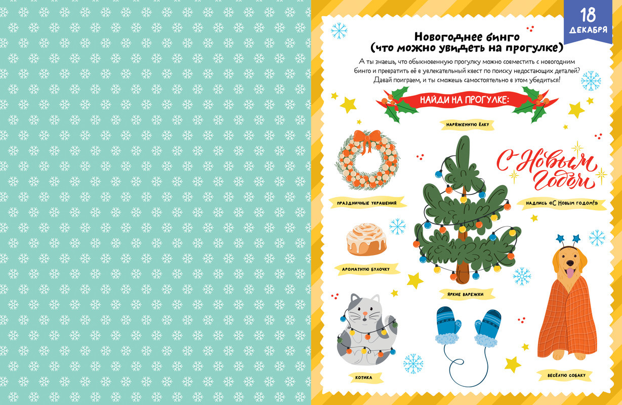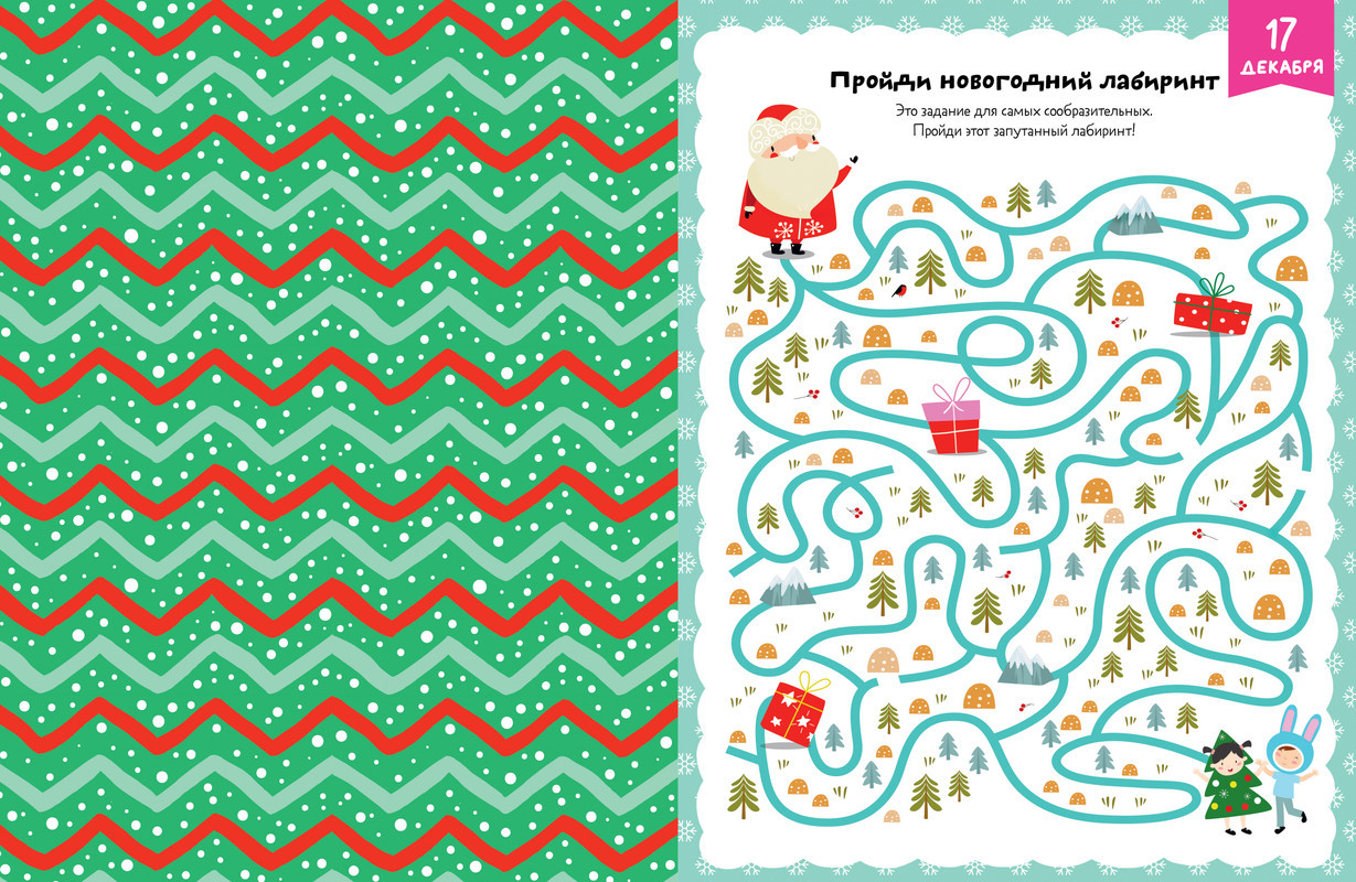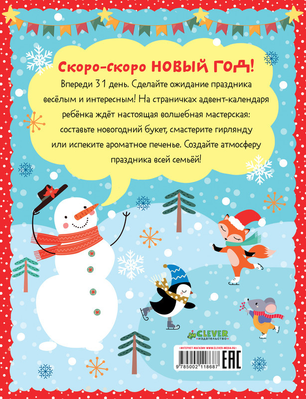 В ожидании Нового года. Адвент календарьновинка В данный момент этот товар отсутствует в продаже. Возможно, у нас найдется аналогичный или похожий товар здесь. Серия: Новый Год На страничках адвент-календаря «В ожидании Нового года» мальчиков и девочек ждет настоящая волшебная мастерская: составьте новогодний букет, смастерите праздничные украшения, кормушку для птиц, игрушки изо льда, заверните подарки, напишите письмо Деду Морозу, а еще выполняйте развивающие задания на внимание, логику, для тренировки памяти и мелкой моторики — лабиринты, кроссворды и многое другое. И обязательно испеките любимое печенье Деда Мороза по рецепту в книге. |