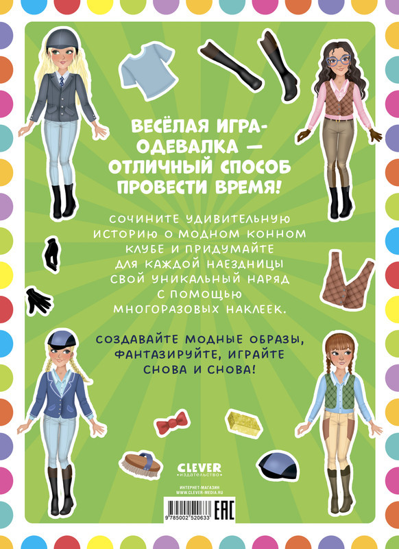 Серия: Наряди куколку Книжка с наклейками «Лошадки» понравится тем, кто любит одевать кукол, подбирать модные наряды и играть со стикерами! На 4 листах наклеек есть вся необходимая одежда (платья, аксессуары) для того, чтобы создавать образы подружкам — наездницам модного конного клуба. Одевалка «Лошадки» развивает фантазию и художественный вкус, а игра со стикерами тренирует мелкую моторику, глазомер и логическое мышление. Какой наезднице какой костюм подойдет? А какие аксессуары стоит подобрать? Книга-игра позволит дошкольникам 5, 6, 7 лет одевать кукол прямо на страницах и станет отличным подарком для девочки-модницы — дочки или внучки на день рождения (ДР) и Новый год (НГ). Одевалкой с наклейками можно дополнить праздничный набор или подарочный комплект развивающих книг. Книжку с наклейками «Лошадки» в мягкой обложке можно отнести в детский сад, а можно взять с собой в дорогу. |