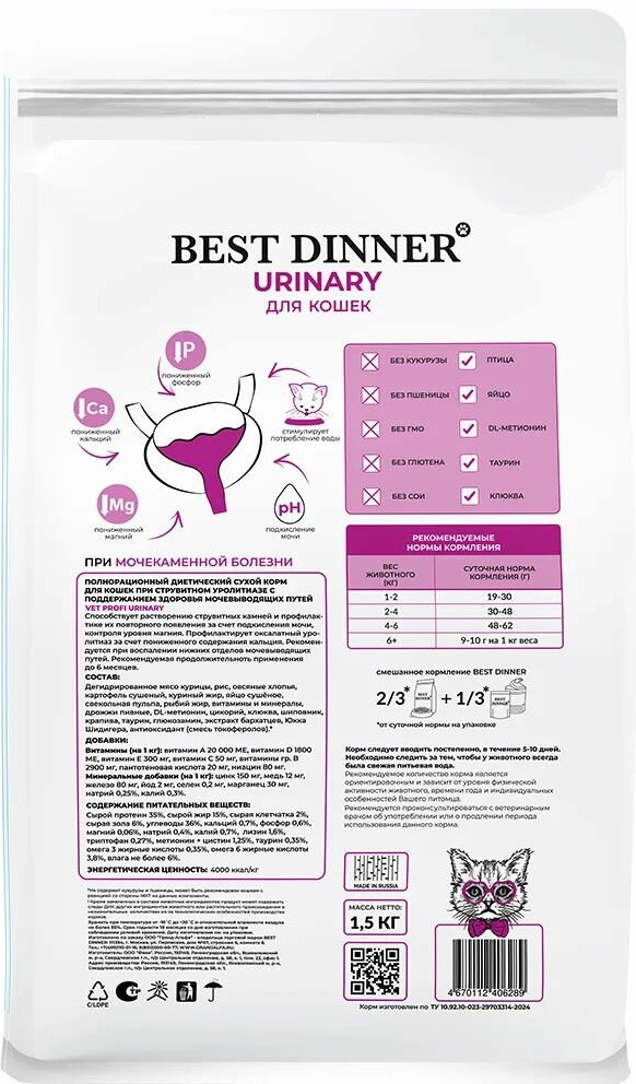 Best Dinner Диетический сухой корм для кошек при струвитном уролитиазе с поддержанием здоровья мочевыводящих путей «Urinary»