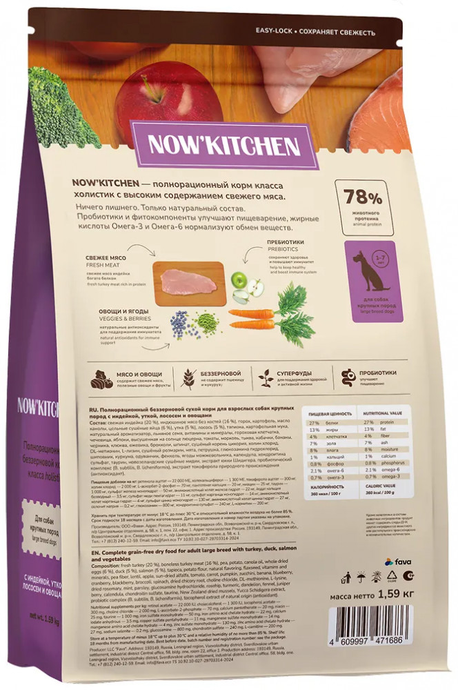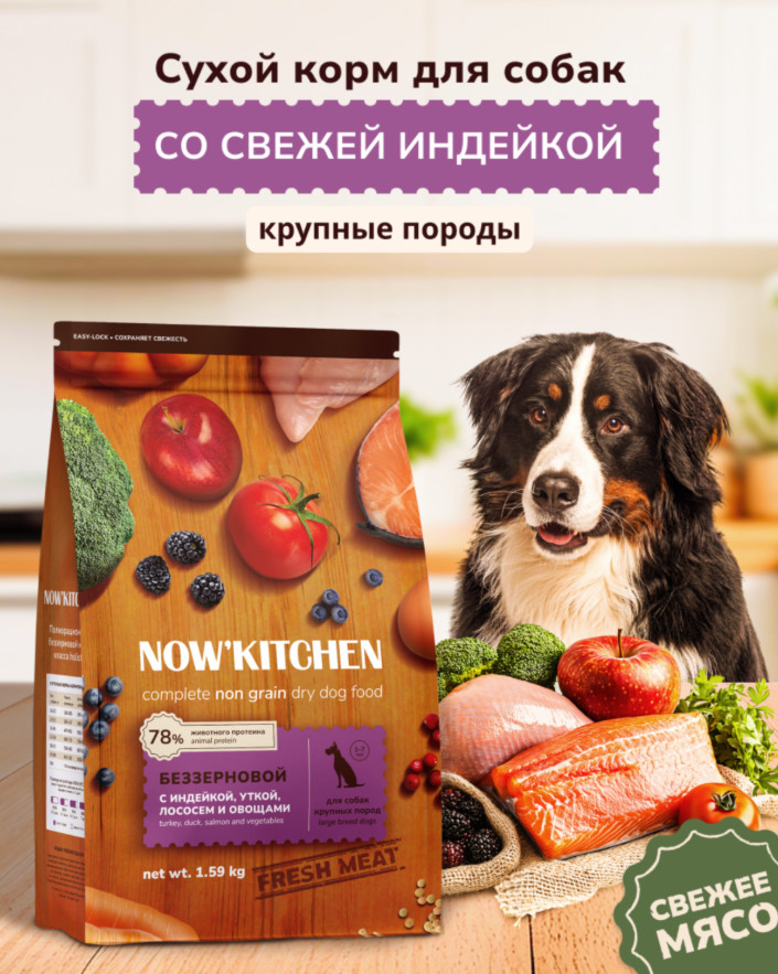 Now'Kitchen Корм беззерновой для взрослых собак крупных пород со свежей индейкой, уткой, лососем «Turkey, Duck & Salmon»