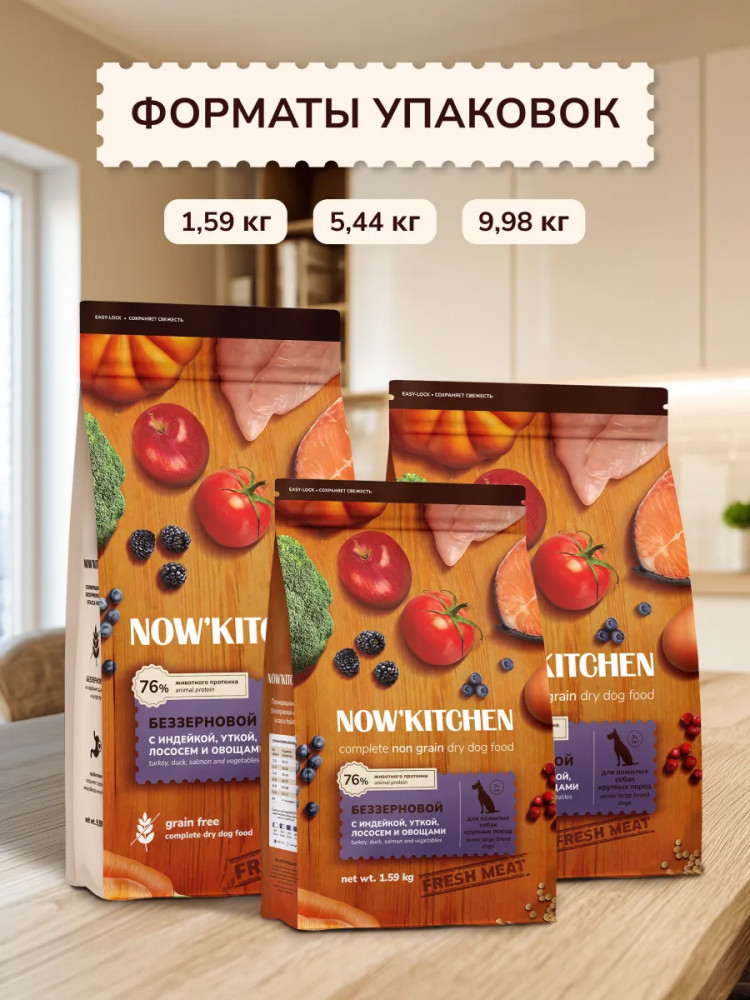 Now'Kitchen Корм беззерновой для для пожилых крупных собак со свежей индейкой, уткой, лососем «Turkey, Duck & Salmon»