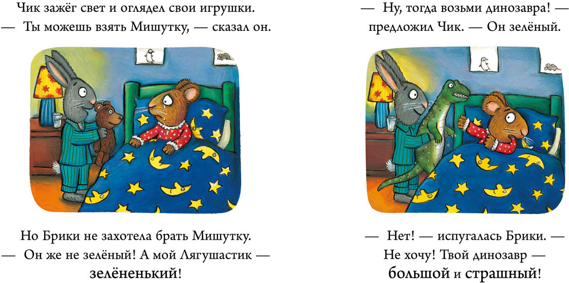 В данный момент этот товар отсутствует в продаже. Возможно, у нас найдется аналогичный или похожий товар здесь. Серия: Чик и Брики Брики приехала к Чику в гости с ночёвкой. Друзья играли целый день! Расставили машинки по всему полу, устроили ферму под стулом, и ещё придумали классную игру — «Пираты в больнице». Всё было прекрасно до тех пор, пока не пришло время спать. Брики вдруг поняла, что забыла взять свою любимую игрушку — Лягушатника! Трогательная история про любимые игрушки и настоящих друзей, которые всегда поддержат и поделиться самым дорогим. = |