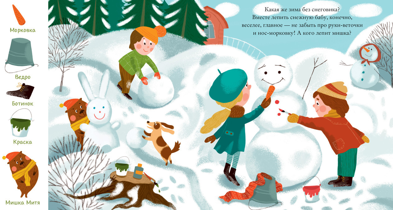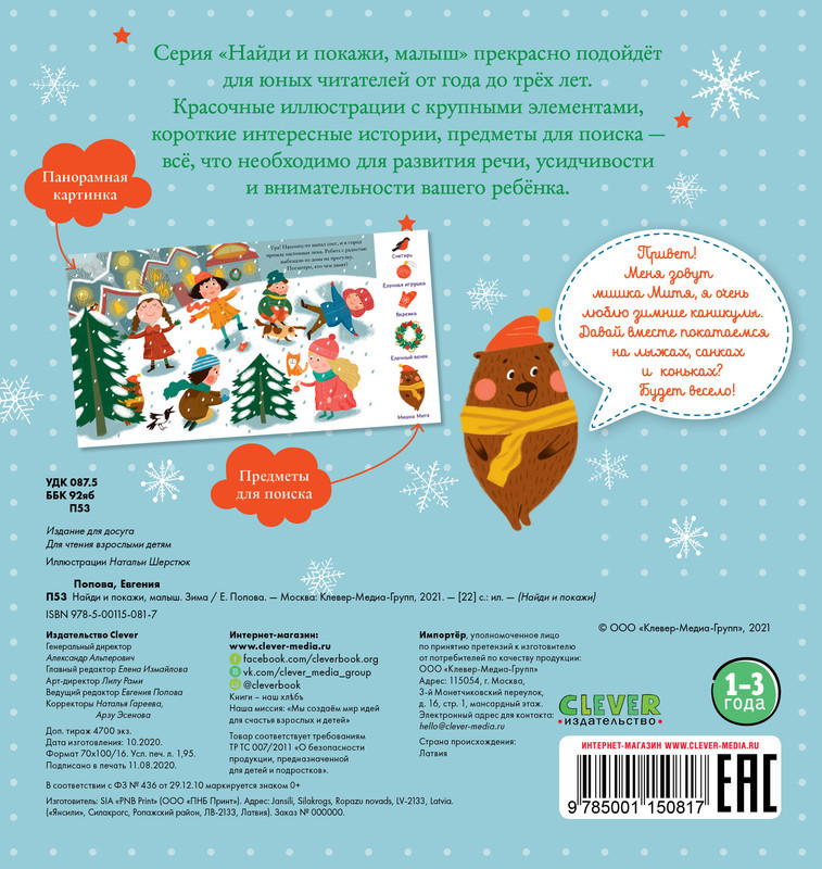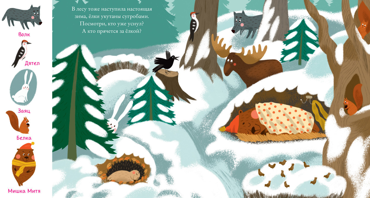 Серия: Найди и покажи, малыш Книга «Найди и покажи, малыш. Зима» — новогодний виммельбух для детей до 3 лет. На страницах с яркими панорамными картинками вы найдете 45 предметов для поиска. Играйте, узнавайте новые слова, рассматривайте картинки, сочиняйте истории, рассказывайте малышу о зиме! |