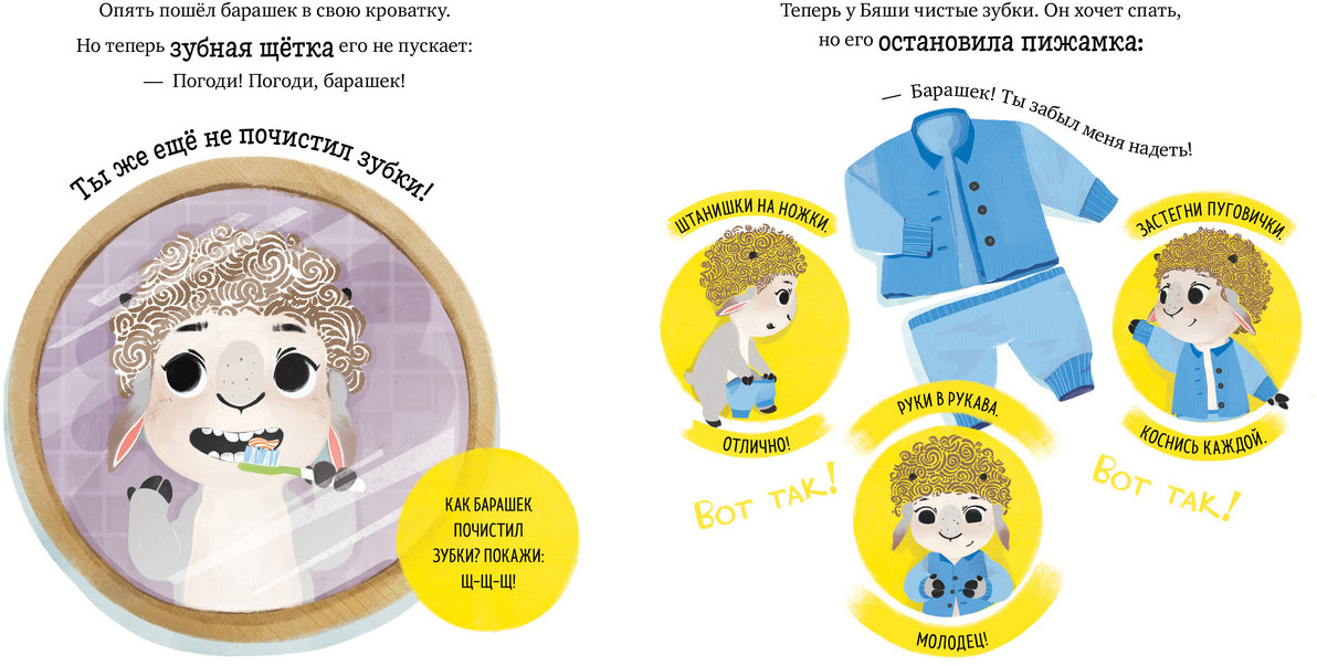 С книгой можно и нужно играть: читая сказку, малыш вовлечен в сюжет книги и повторяет все действия вместе с главным героем. Взрослым не надо больше выдумывать задания по картинкам — в книге есть наводящие вопросы, написанные доступным для малыша языком. После прочтения сказки малыш сам будет пересказывать вам действия барашка Бяши и учить буквально всех вокруг тому, что он узнал из книги.