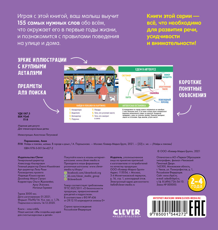 Серия: Найди и покажи, малыш Книга «Найди и покажи, малыш. В городе и дома» это яркие иллюстрации с крупными деталями и короткие понятные объяснения. Играя с книгой «Дома и в городе», ваш малыш выучит 155 самых нужных слов обо всем, что окружает его в первые годы жизни, и познакомится с правилами поведения на улице и дома. Книги серии «Найди и покажи, малыш» — всё, что необходимо для развития речи, усидчивости и внимательности вашего ребенка! |