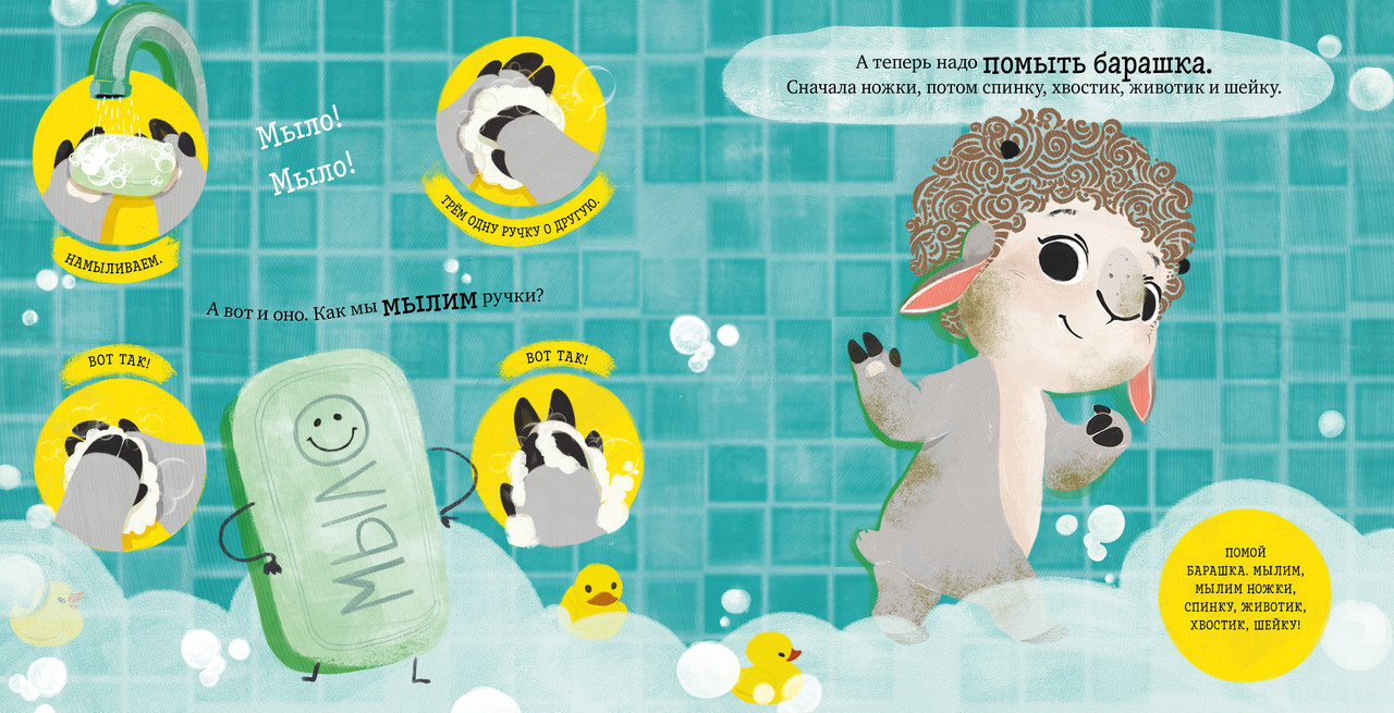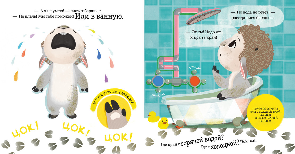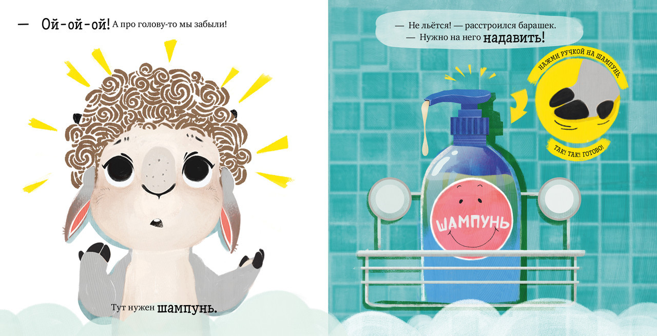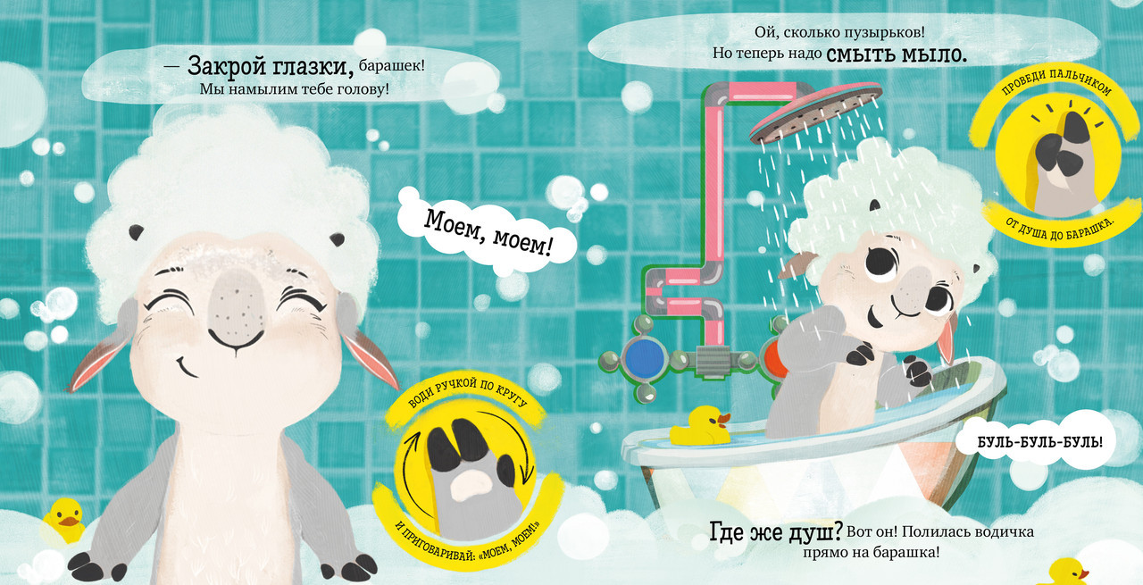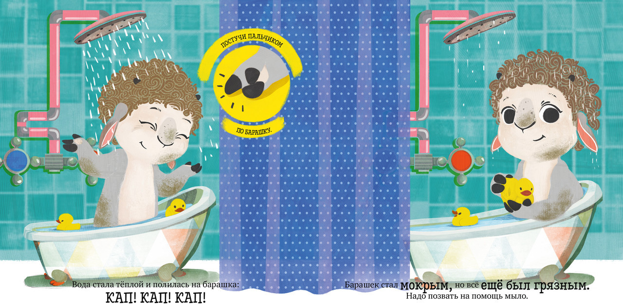 Серия: Играем. Учимся. Развиваемся Это интерактивная книжка-картинка с милым героем, который, как и ваш малыш, только начинает познавать мир. Вместе они будут делать первые открытия и осваивать важные навыки. Эта книга-игра с купанием и поможет сделать этот ежедневный ритуал интересным. Маленький барашек Бяша любит играть и веселиться, а вот купаться и мыть голову ему совсем не нравится! Ребенку предстоит помочь барашку Бяше открыть кран, помыть шерстку и вытереться полотенцем. С книгой можно и нужно играть: малыш вовлечен в сюжет сказки, практически повторяет все действия вместе с главным героем и таким образом легко и весело учится жизненным навыкам. Не удивляйтесь, если ребенок сам будет пересказывать вам действия барашка Бяши и учить буквально всех вокруг тому, что он узнал из книги! |