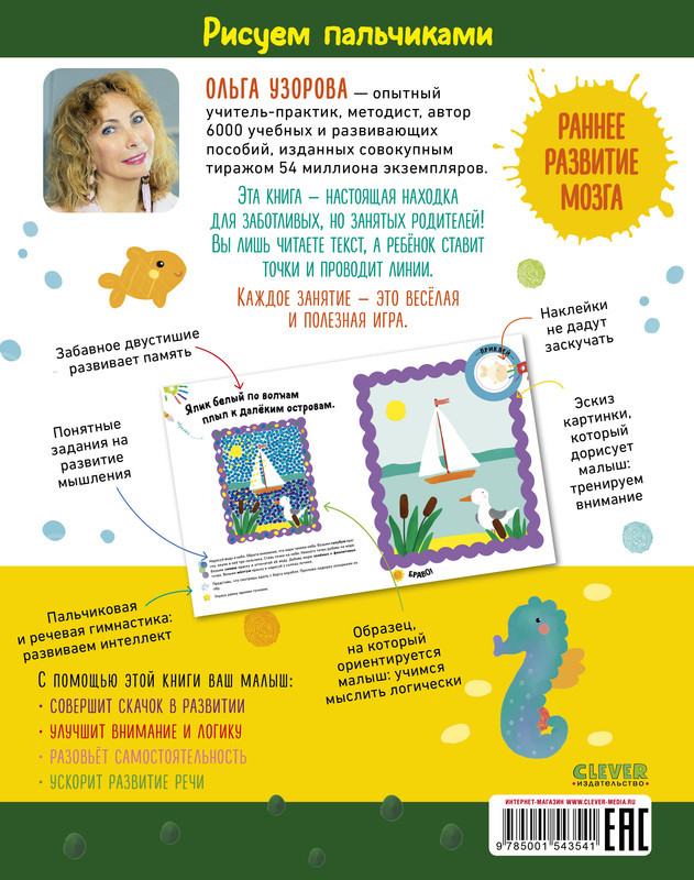 Серия: Раннее развитие мозга Эта книга — настоящая находка для заботливых, но занятых родителей! Вы лишь читаете текст, а ребенок ставит точки и проводит линии. Каждое занятие — это весёлая и полезная игра. А еще в книге 80 наклеек! С помощью этой книжки ваш малыш: совершит скачок в развитии, улучшит внимание и логику, разовьёт самостоятельность, ускорит развитие речи. |