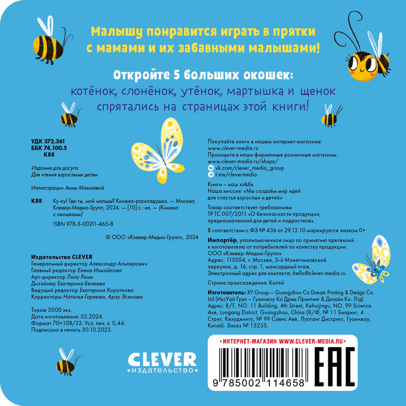 Ку-ку! Где ты, мой малыш? Книжка-раскладушкановинка В данный момент этот товар отсутствует в продаже. Возможно, у нас найдется аналогичный или похожий товар здесь. Серия: Книжка с окошками "Ку-ку! Где ты, мой малыш? Книжка-раскладушка«— идеальная первая книга для развития внимательности ребенка. Ищите на картинках лапки, хвостики, ушки, макушки, а их маленьких хозяев— под большими клапанами. На каждом развороте— своя мини история. Читайте ее вслух, открывайте окошко для развития сюжета: где же прячутся котенок, слоненок, утенок, мартышка и щенок? Ку-ку! Произносите вслух вместе звукоподражательные подписи— это полезное упражнение для запуска речи ребенка. Книга создана для самых маленьких ручек: плотные страницы не помнутся, а скругленные уголки не поранят пальчики. Читайте, изучайте животных и развивайте мелкую моторику, речь и память малыша в увлекательной игре-угадайке. |