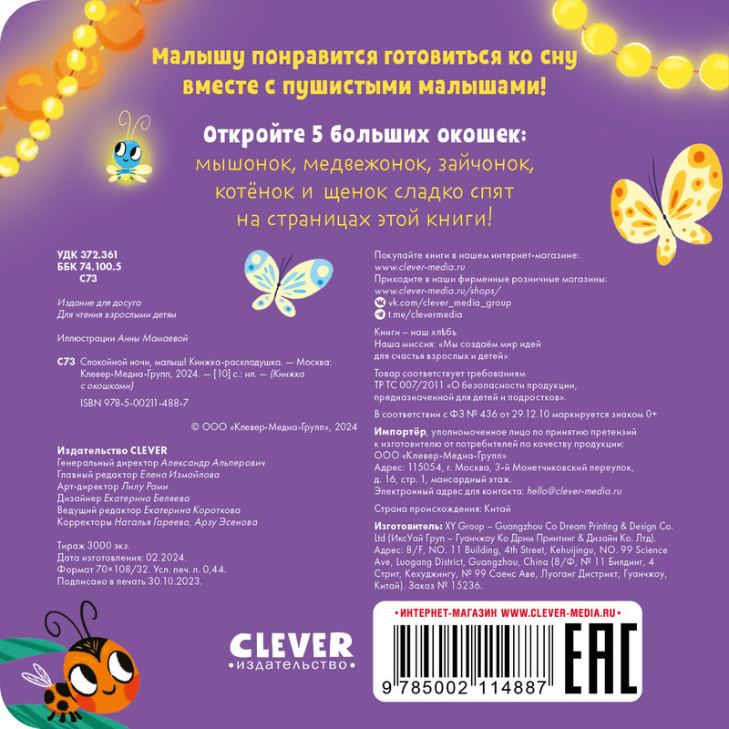 Спокойной ночи, малыш! Книжка-раскладушкановинка В данный момент этот товар отсутствует в продаже. Возможно, у нас найдется аналогичный или похожий товар здесь. Серия: Книжка с окошками Книжка с окошками «Спокойной ночи, малыш!» — идеальный помощник для родителей в укладывании детей спать. Слушая чтение взрослого и открывая окошки, ребенок настроится на сонный лад, а еще повторит, что нужно сделать перед сном: почистить зубки, надеть пижамку, послушать колыбельную, выключить свет. На каждом развороте — своя маленькая сказка. Читайте ее вслух, открывайте большой клапан для развития сюжета, рассматривайте сладко дремлющих в кроватках пушистых героев. Присмотритесь, что снится мышонку, медвежонку, зайчонку, котенку и щенку? Книжка-раскладушка создана для самых маленьких ручек: плотные картонные страницы не помнутся, а скругленные уголки не поранят пальчики. Читайте с первых лет жизни ребенка и создавайте традицию совместного чтения перед сном, которая останется с вами надолго. |