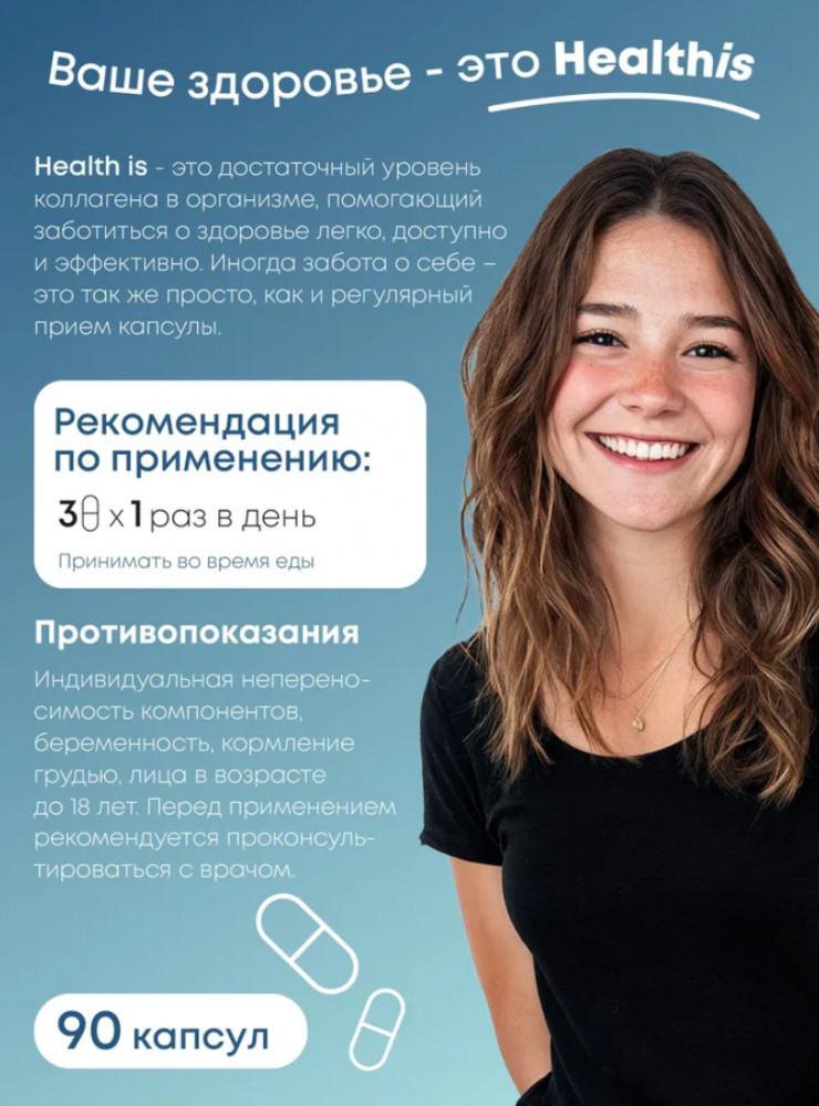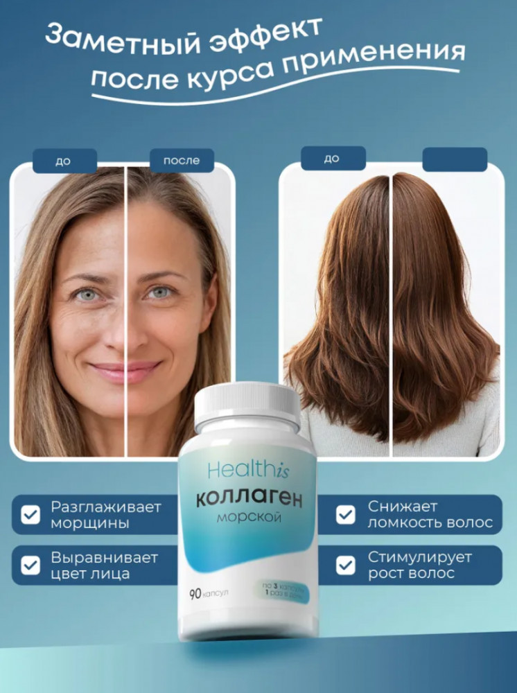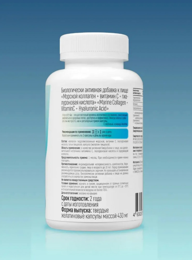 Морской коллаген (Marine Collagen) от Healthis — это источник высокоочищенного коллагена пептидов, обогащённый гиалуроновой кислотой для усиленного действия. Коллаген играет ключевую роль в поддержании здоровья кожи, суставов, связок, а также укреплении волос и ногтей. Благодаря высокой биодоступности, морской коллаген усваивается организмом значительно лучше, чем другие формы, обеспечивая видимый эффект уже через несколько недель регулярного приёма. Морской коллаген (collagen peptides) от Healthis представлен в форме капсул, что обеспечивает удобство приёма и отличное усвоение.