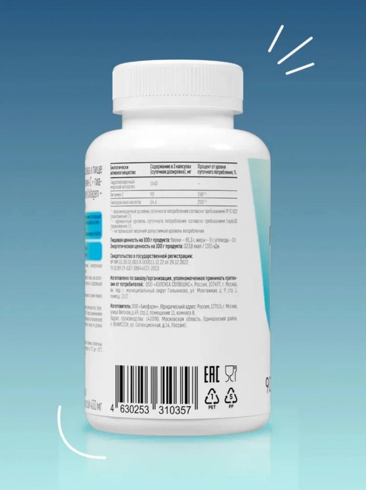 В 3 капсулах — 1140 мг морского коллагена, 54,6 мг гиалуроновой кислоты и 90 мг витамина С.