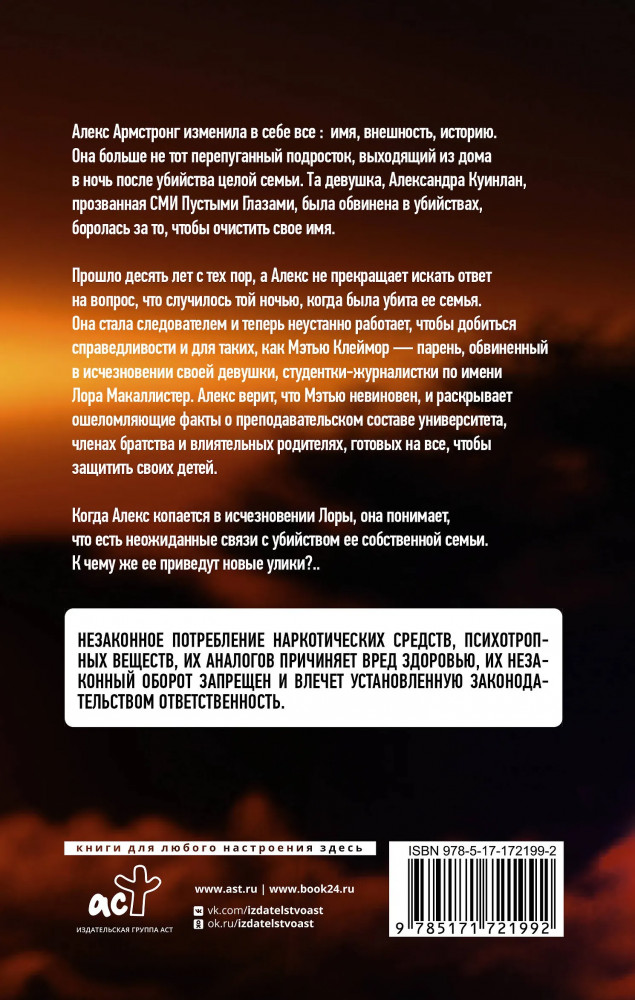 Серия: Новый мировой триллер Алекс Армстронг изменила в себе все : имя, внешность, историю. Она больше не тот перепуганный подросток, выходящий из дома в ночь после убийства целой семьи. Та девушка, Александра Куинлан, прозванная СМИ Пустыми Глазами, была обвинена в убийствах, боролась за то, чтобы очистить свое имя.