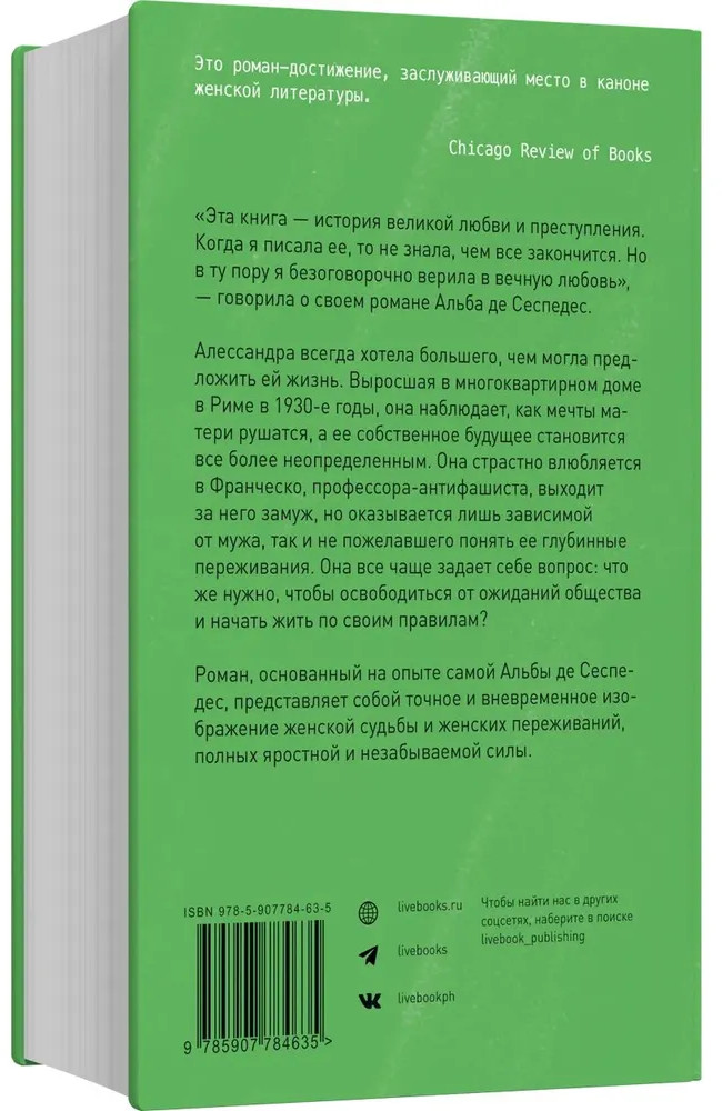 Алессандра всегда хотела большего, чем могла предложить ей жизнь. Выросшая в многоквартирном доме в Риме в 1930-е годы, она наблюдает, как мечты матери рушатся, а ее собственное будущее становится всё более неопределённым. Она страстно влюбляется в Франческо, профессора-антифашиста, выходит за него замуж, но оказывается лишь зависимой от мужа, так и не пожелавшего понять её глубинные переживания. Она всё чаще задаёт себе вопрос: что же нужно, чтобы освободиться от ожиданий общества и начать жить по своим правилам? Роман, основанный на опыте самой Альбы де Сеспедес, представляет собой точное и вневременное изображение женской судьбы и женских переживаний, полных яростной и незабываемой силы. |