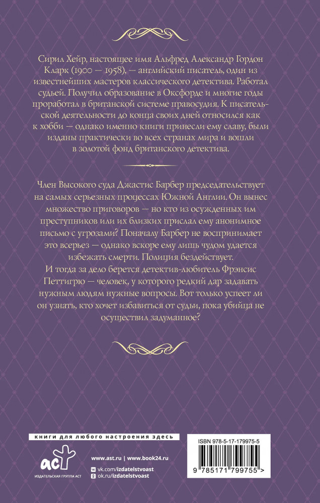 Серия: Классический детектив Член Высокого суда Джастис Барбер председательствует на самых серьезных процессах Южной Англии. Он вынес множество приговоров — но кто из осужденных им преступников или их близких прислал ему анонимное письмо с угрозами? Поначалу Барбер не воспринимает это всерьез — однако вскоре ему лишь чудом удается избежать смерти. Полиция бездействует. |