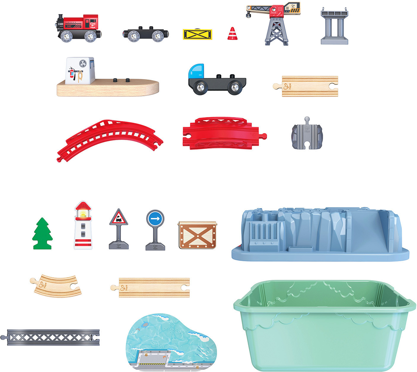 • разнообразие деталей: комплект включает 50 элементов — рельсы, мост, грузовой поезд, грузовик, подъемный кран и аксессуары;