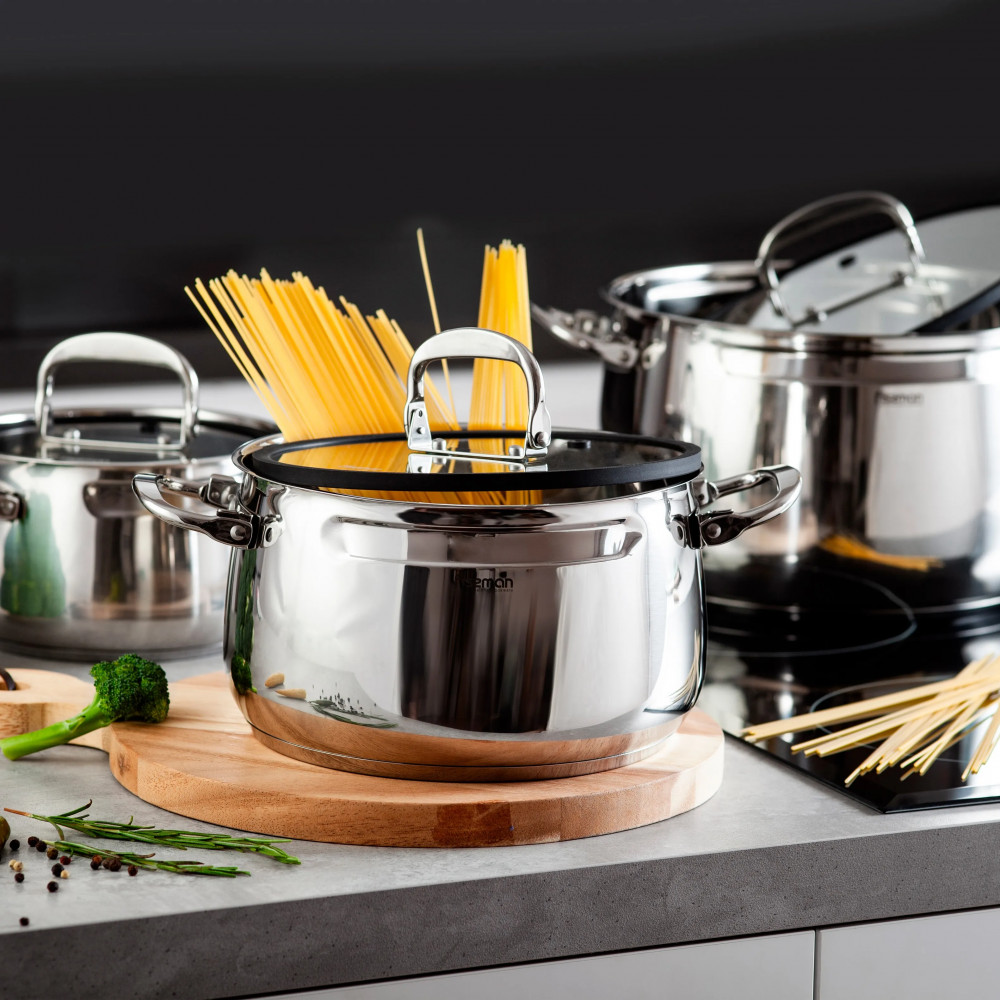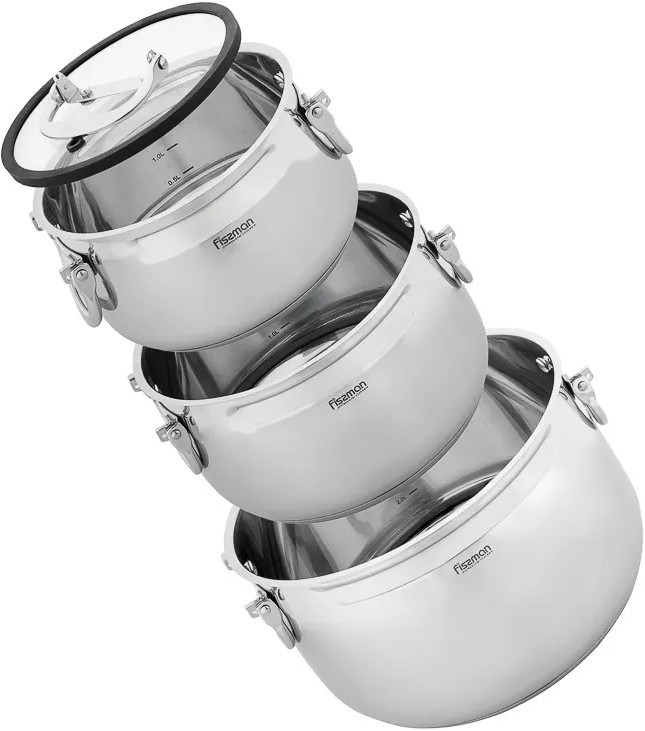 Iron elegance — это инновационная разработка Fissman. В отличие от стандартных кастрюль, эта модель продумана до мелочей: складывающиеся ручки не мешают при хранении, а крышка помещается внутрь, превращая хранение в максимально компактное. Такой подход особенно удобен для небольших кухонь или для тех, кто ценит порядок. Если у вас ограничено пространство, выбирайте кастрюли Iron elegance — вы сможете хранить целый комплект в одном шкафу, не перегружая полки. Это решение также удобно для дачи или кемпинга, где важна мобильность и компактность.