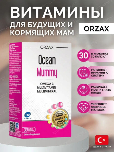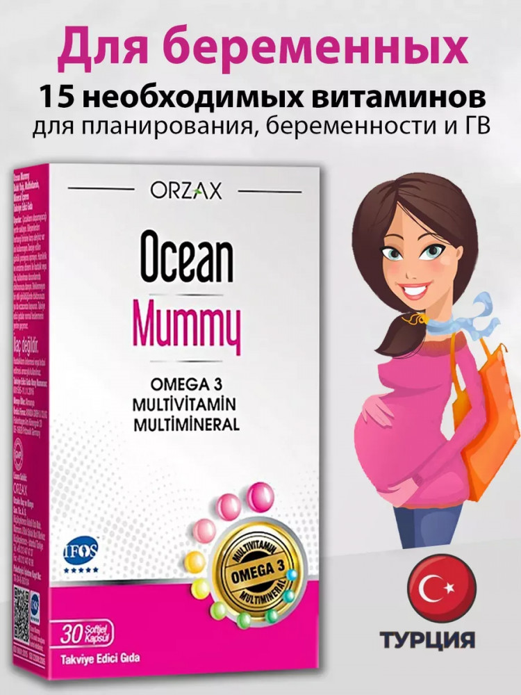 Orzax Ocean Mummy — турецкие бады, разработанные специально для беременных и кормящих женщин. Продукт содержит целый набор питательных веществ и минералов, обеспечивающих здоровье женского организма и хорошее самочувствие. Мультивитамин включает омегу 3, DHA и EPA, которые играют важную роль в развитии мозга, глаз и зрения у ребенка. Рыбий жир помогает укрепить сердце и сосуды. Фолиевая кислота, входящая в состав витаминного комплекса, предупреждает появление дефектов нервной трубки плода. Биотин полезен для кожи, волос и ногтей. |
