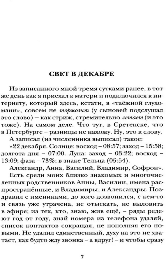В новой книге писателя Василия Ивановича Аксёнова читатель вновь столкнётся с реальной жизнью потомков первопроходцев Сибири, которые продолжают своё жизненное путешествие в таёжной Ялани — географически небольшой, но по-своему необычайно прекрасной местности. История и вечность, жизнь и смерть, совесть, верность, любовь — вот основные координаты этой книги. Роман «Свет» поднимает множество современных, в том числе неразрешённых вопросов, предлагая и читателю стать деятельным «соработником века сего». |