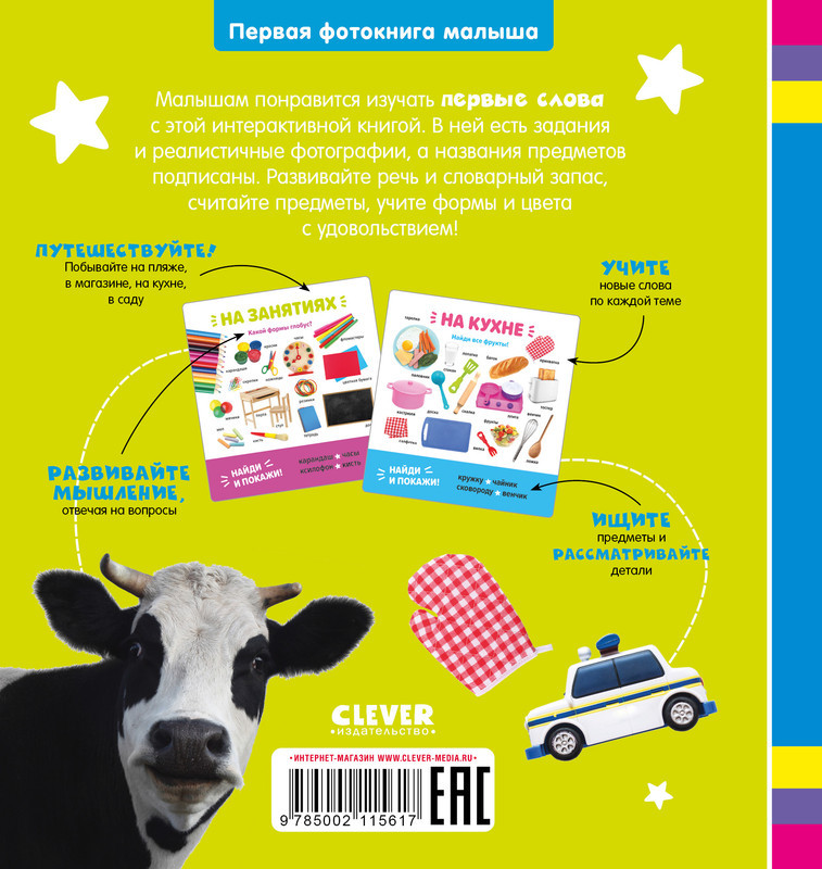 Серия: Первая фотокнига малыша Малышам понравится изучать первые слова с этой интерактивной книгой. В ней есть задания и реалистичные фотографии, а названия предметов подписаны. Развивайте речь и словарный запас, считайте предметы, учите формы и цвета с удовольствием! |