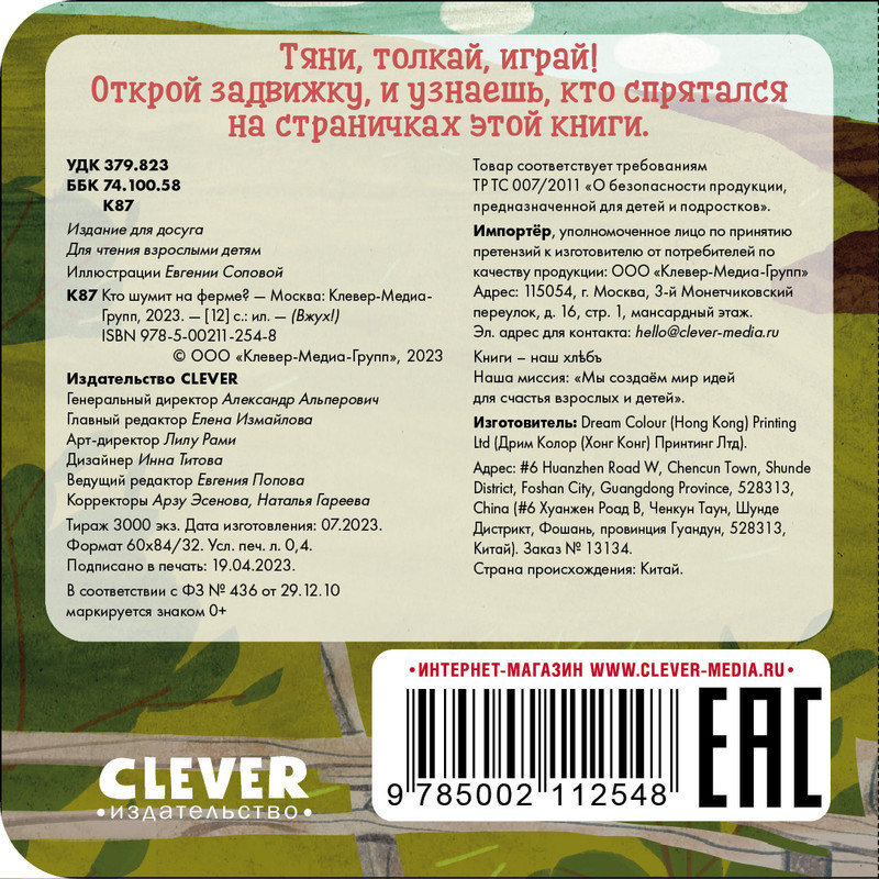 Серия: Вжух! «Вжух! Кто шумит на ферме?» — это миниатюрная книжка-игрушка, созданная специально для маленьких детских ручек. Плотные картонные странички выдержат даже самый активный детский интерес, а яркие картинки, задания и игра с открыванием створок помогут ребенку изучать окружающий мир и учить новые слова. Открывайте эту книжку и отправляйтесь на увлекательную экскурсию по ферме. Что помогает пахать землю, куда грузовик везет зерно, что в прицепе у трактора? Толкайте створки и ищите ответы под ними! Книга будет интересна малышу уже с полугода. Сначала в качестве развивающей игрушки: ребенок может сам листать картонные странички, разглядывать картинки и двигать рычажки. А позже книжка станет первым пособием по изучению новых слов, предметов и явлений. |