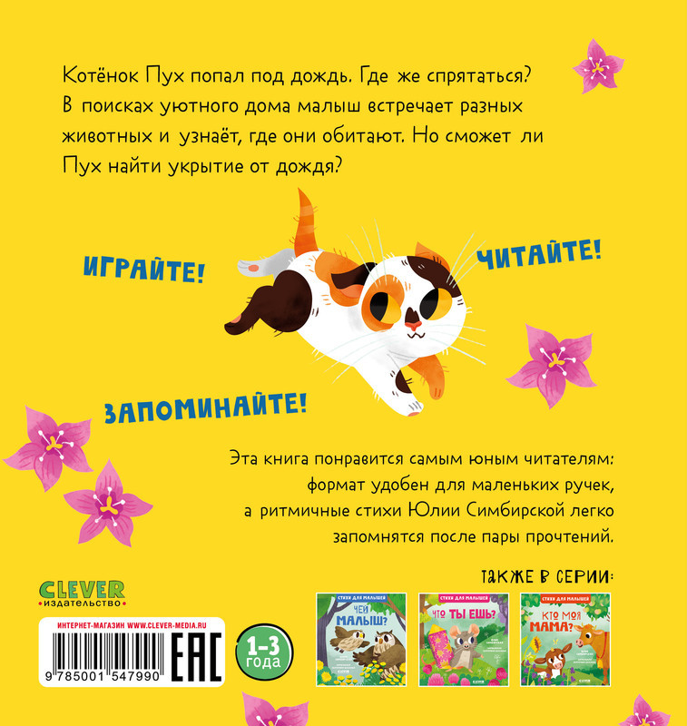Книга «Кто живет здесь?» — это милая сказка в стихах, чудесные картинки и очаровательные персонажи. А компактный формат удобен для маленьких ручек. По сюжету в поисках уютного дома котенок Пух встречает разных животных и узнает, где они обитают. Но сможет ли малыш найти укрытие от дождя? В книжке ребенок с удовольствием запомнит короткие стихи Юлии Симбирской после пары прочтений и будет с радостью возвращаться к истории снова и снова. Почему так важно читать детям? Чтение стихотворений — это нагрузка для мозга. Читая, мы его тренируем. Важная задача стихотворений — сделать жизнь ребенка ярче и интереснее. Ведь гораздо веселее гулять с мамой или папой, когда рассказываешь стихи.