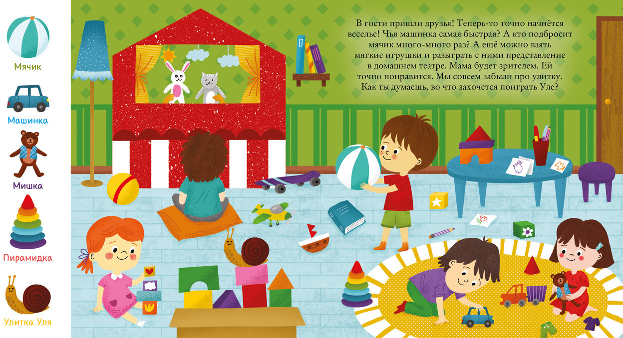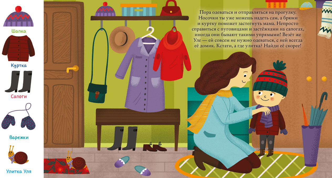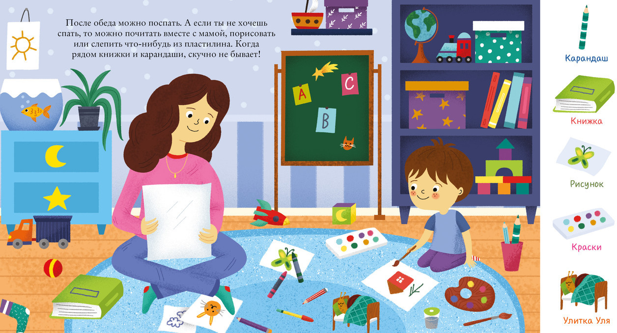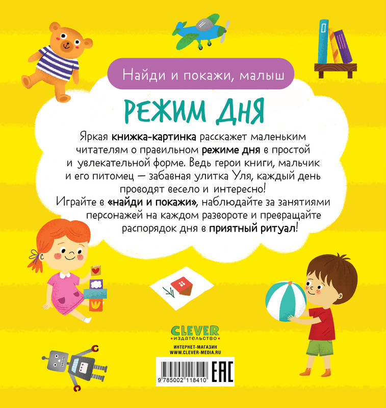 В данный момент этот товар отсутствует в продаже. Возможно, у нас найдется аналогичный или похожий товар здесь. Серия: Найди и покажи, малыш Яркая обучающая и развивающая книжка-картинка «Найди и покажи, малыш. Режим дня» расскажет маленьким читателям о правильном режиме дня в простой и увлекательной форме, помогая родителям в воспитании детей. Герои книги, мальчик и его питомец — забавная улитка Уля, каждый день проводят весело и интересно!