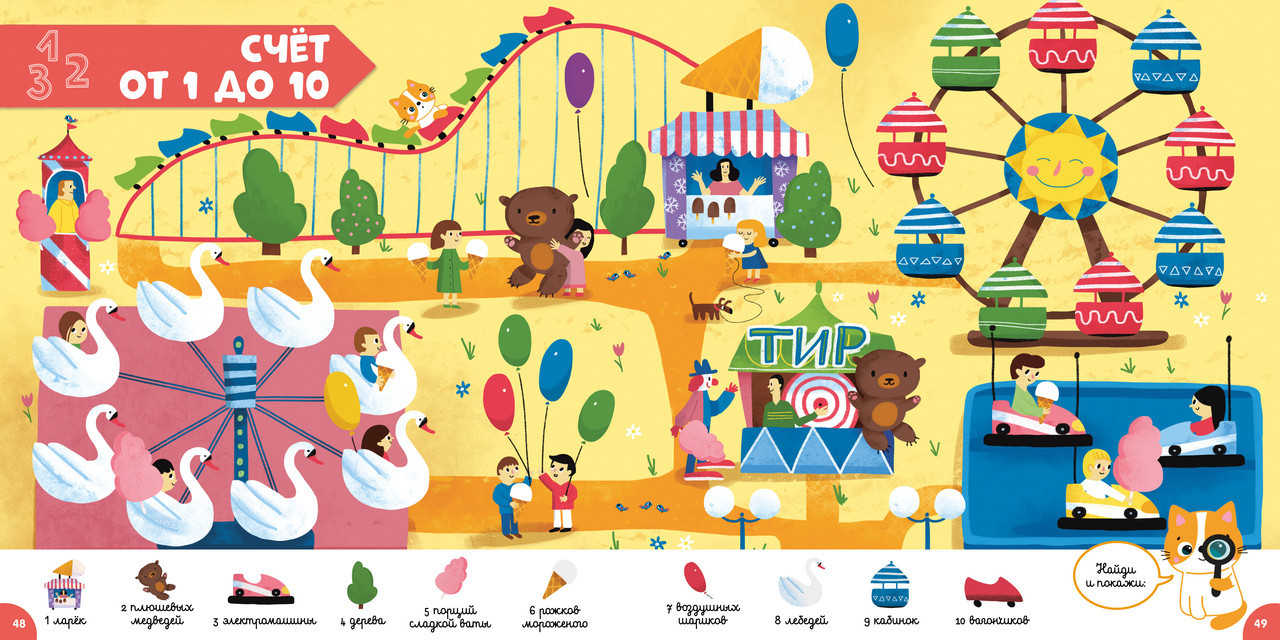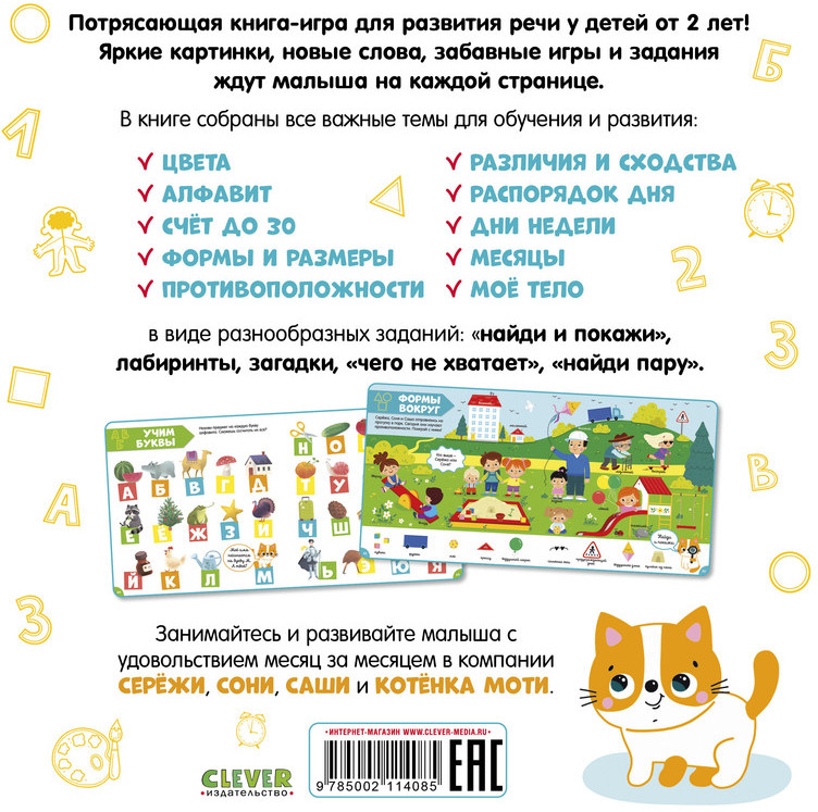 Серия: Главная книга малыша Потрясающая книга-игра для развития речи у детей от 2 лет! Яркие картинки, новые слова, забавные игры и задания ждут малыша на каждой странице. В книге собраны все важные темы для обучения и развития: цвета, алфавит, счёт до 30, формы и размеры, противоположности, различия и сходства, распорядок дня, дни недели, месяцы, моё тело. В виде разнообразных заданий: «найди и покажи», лабиринты, загадки, «чего не хватает», «найди пару». Занимайтесь и развивайте малыша с удовольствием месяц за месяцем в компании Серёжи, Сони, Саши и котёнка Моти. |