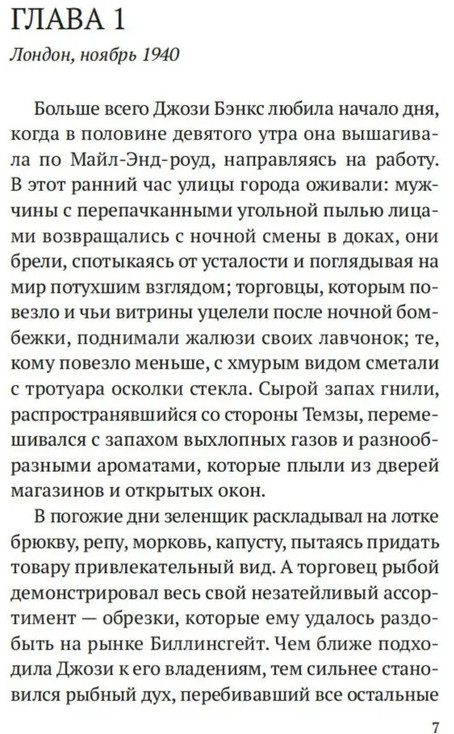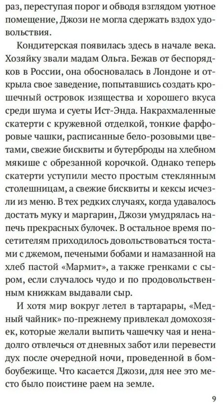 Серия: Роман с историей 1940 год. Немецкие самолеты утюжат Лондон, и Джози Бэнкс беспомощно наблюдает, как рушится ее жизнь: муж Стэн отправился на фронт, их дом после бомбежки превратился в груду щебня, а хозяйка чайной, где работала Джози, погибла под развалинами... Молодая женщина чудом выжила сама, но осталась без денег и крыши над головой. Как и тысячи других эвакуированных лондонцев, Джози отправляется в сельскую местность и оказывается в особняке аристократки мисс Харкорт, которая вовсе не рада тому, что ее «уплотнили». Правда, мисс Харкорт все же разрешает Джози открыть в ее доме чайную, и здесь девушка знакомится с Майком Джонсоном, канадским пилотом с расположенного неподалеку военного аэродрома. Между молодыми людьми мгновенно вспыхивает чувство, но Джози все же не считает возможным бросить нелюбимого Стэна. |