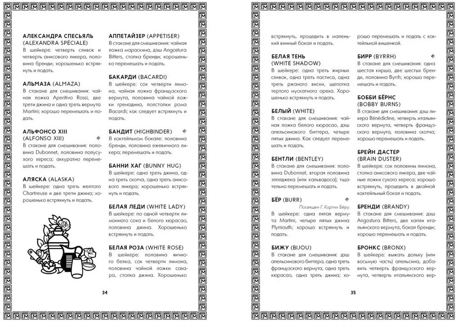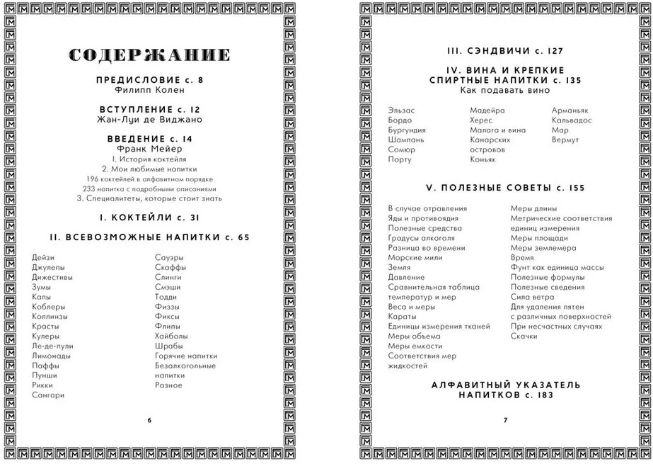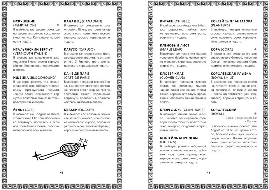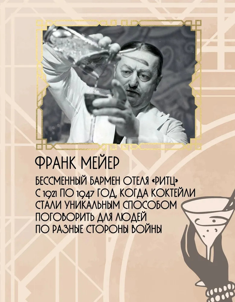 Незаменимое руководство, созданное легендарным Франком Мейером, бессменным барменом отеля «Ритц» с 1921 по 1947 год, впервые публикуется на русском языке. Эта библия миксологии раскрывает секреты приготовления более чем 300 коктейлей, в числе которых — творения самого Мейера, который смешивал напитки для Рузвельта, Хемингуэя и Коула Портера. А еще эта книга учит искусству жить. На ее страницах вам встретится множество любопытных и неожиданных советов: по оказанию первой помощи при утоплении, солнечном ударе или змеиных укусах, а также удивительных сведений, включая рецепты сэндвичей, таблицы соответствий единиц измерения, карту расстояний и таблицу силы ветра, совет по заточке затупившихся напильников или, наконец, краткую историю скачек, которые так любил Франк Мейер.