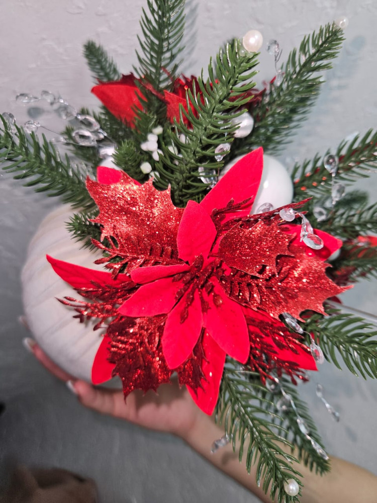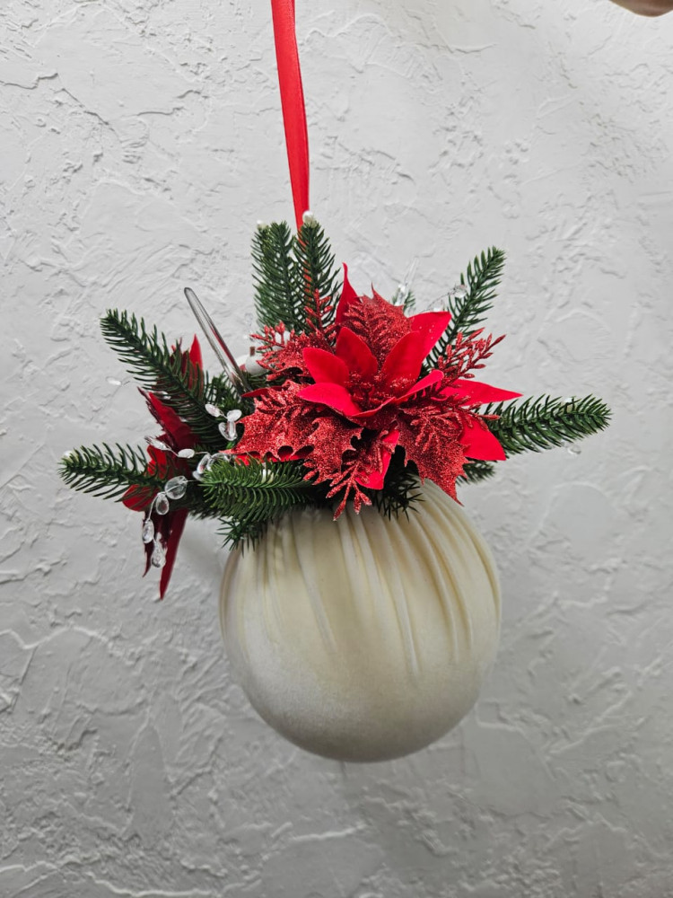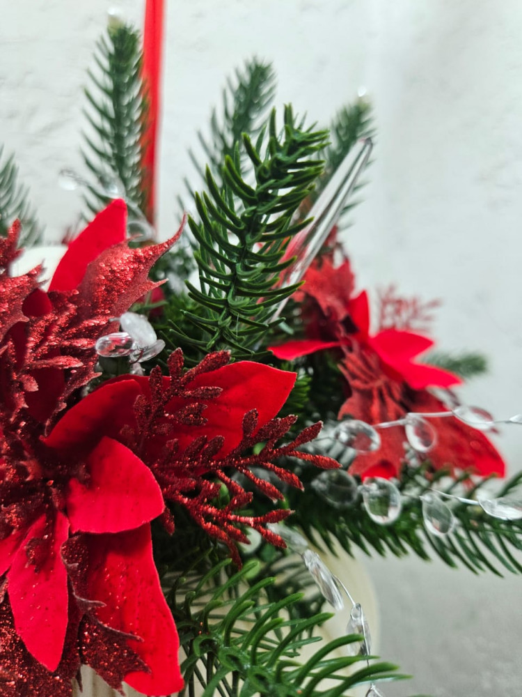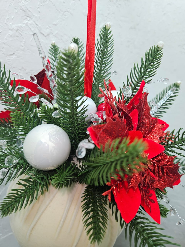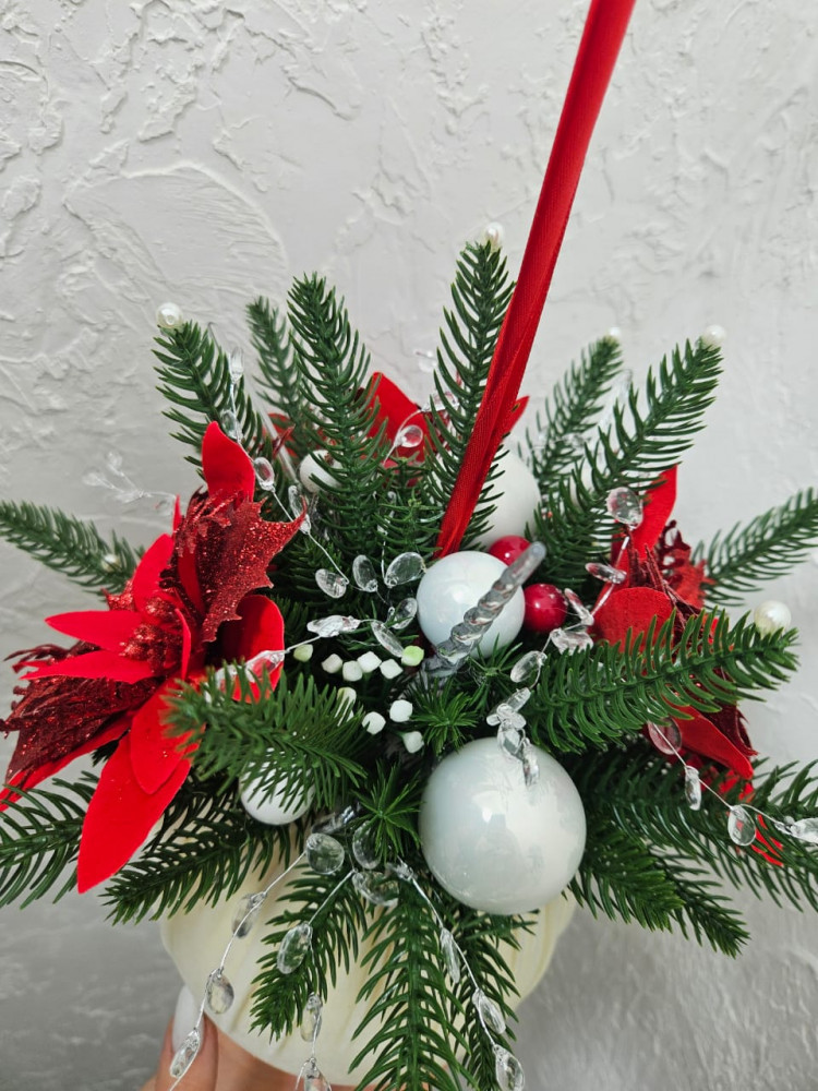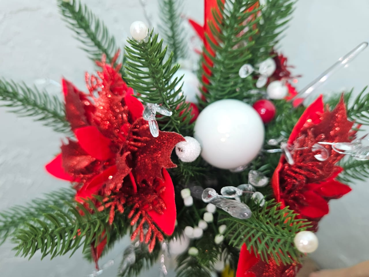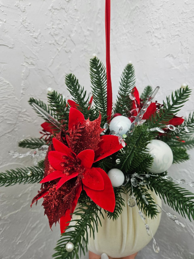 Новогодний шар-букет на окно — очаровательная композиция, которая наполнит ваш дом атмосферой праздника и уюта. Стильное украшение из пушистых еловых веток и ярких красных пуансеттий станет изысканным акцентом на окне, радуя глаз как изнутри, так и снаружи. Лёгкие шары выполнены из пенопласта, поэтому не утяжеляют карниз и безопасны в использовании. Диаметр шара — 15 см, что делает его заметным, но не громоздким элементом декора. Бежево-кремовая основа гармонично оттеняет насыщенную зелень и алые детали, дополненные «ледяными» бусинами и жемчужными вставками. Украшение полностью готово к размещению — просто повесьте его за красную ленту и наслаждайтесь мгновенным новогодним волшебством и уютом в вашем доме! |