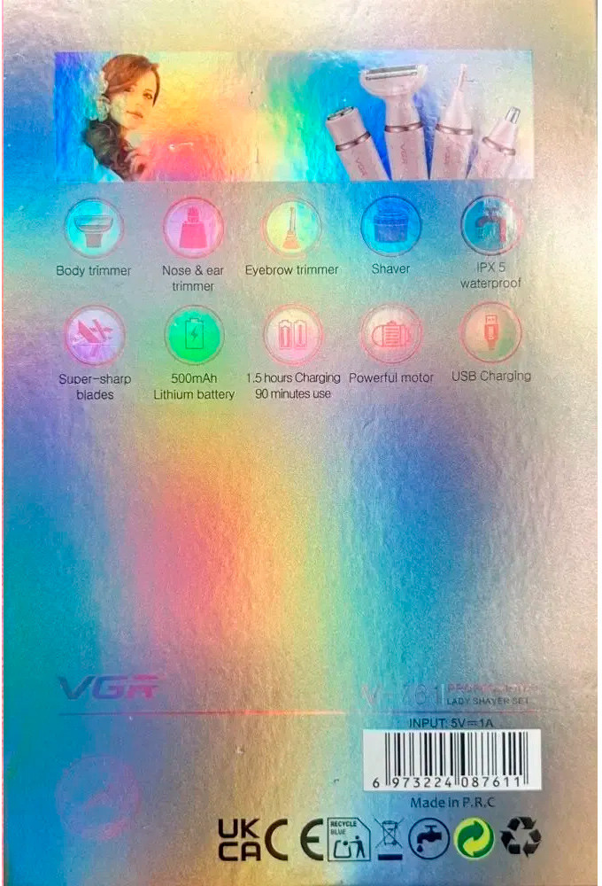 Триммер VGR 761 — отличный выбор для всех участков Вашего тела! Он удобно держится в руке и очень приятен в работе. Обеспечивает более легкие и точные движения идеальный выбор для удаления волос в труднодоступных зонах. Электрическая ручная машинка идеально справляется с подмышками и интимной зоной бикини, не оставляя раздражения на Вашей коже и не допуская врастания волос. Это стильный и эффективный триммер для женского ухода за всем телом. С тремя сменными насадками в комплекте, он может использоваться для стрижки волос в любой нежной зоне. С качественным ножным блоком и регулируемым лезвием, вы можете точно получить желаемый результат. Беспроводной триммер оснащен влагозащитным корпусом IPX5, что гарантирует безопасность использования даже в ванной комнате. Вы можете использовать его для как для всего тела, так и для отдельных труднодоступных зон. Вы всегда можете выглядеть свежо, роскошно и ухоженно, если у вас есть триммер для тела. Это идеальное приобретение для женщин и девушек, кто ищет удобное и эффективное решение для ухода за собой. |