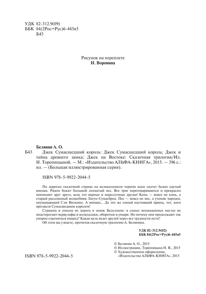 Джек Сумасшедший корольВ данный момент этот товар отсутствует в продаже. Возможно, у нас найдется аналогичный или похожий товар здесь. Серия: Большая иллюстрированная серия По дорогам сказочной страны на великолепном черном коне скачет бедно одетый юноша. Рядом бежит большой лохматый пес. Все трое переговариваются и прекрасно понимают друг друга, ведь это верные и неразлучные друзья! Конь — вовсе не конь, а старый рассеянный волшебник |