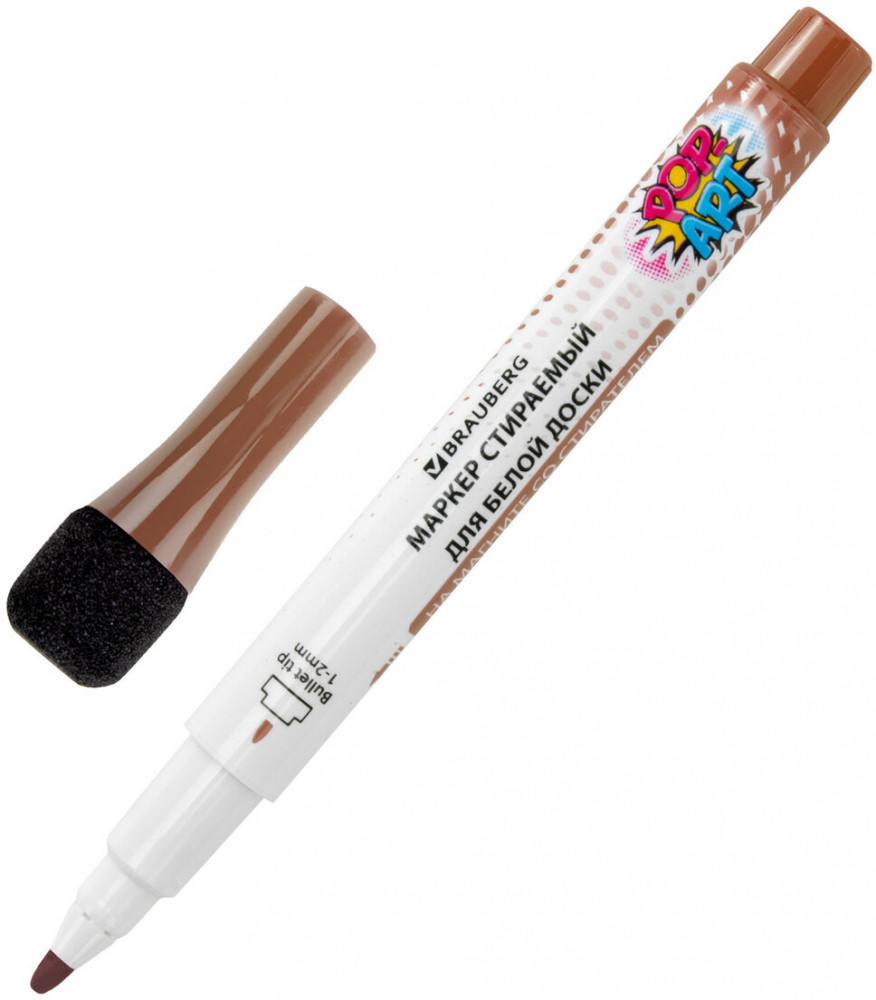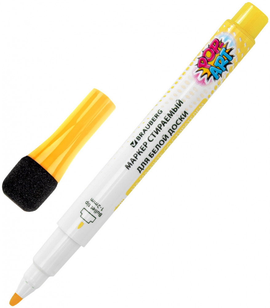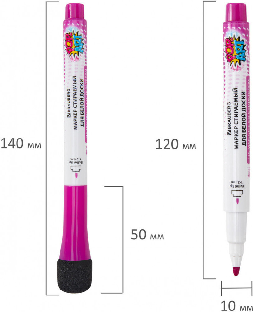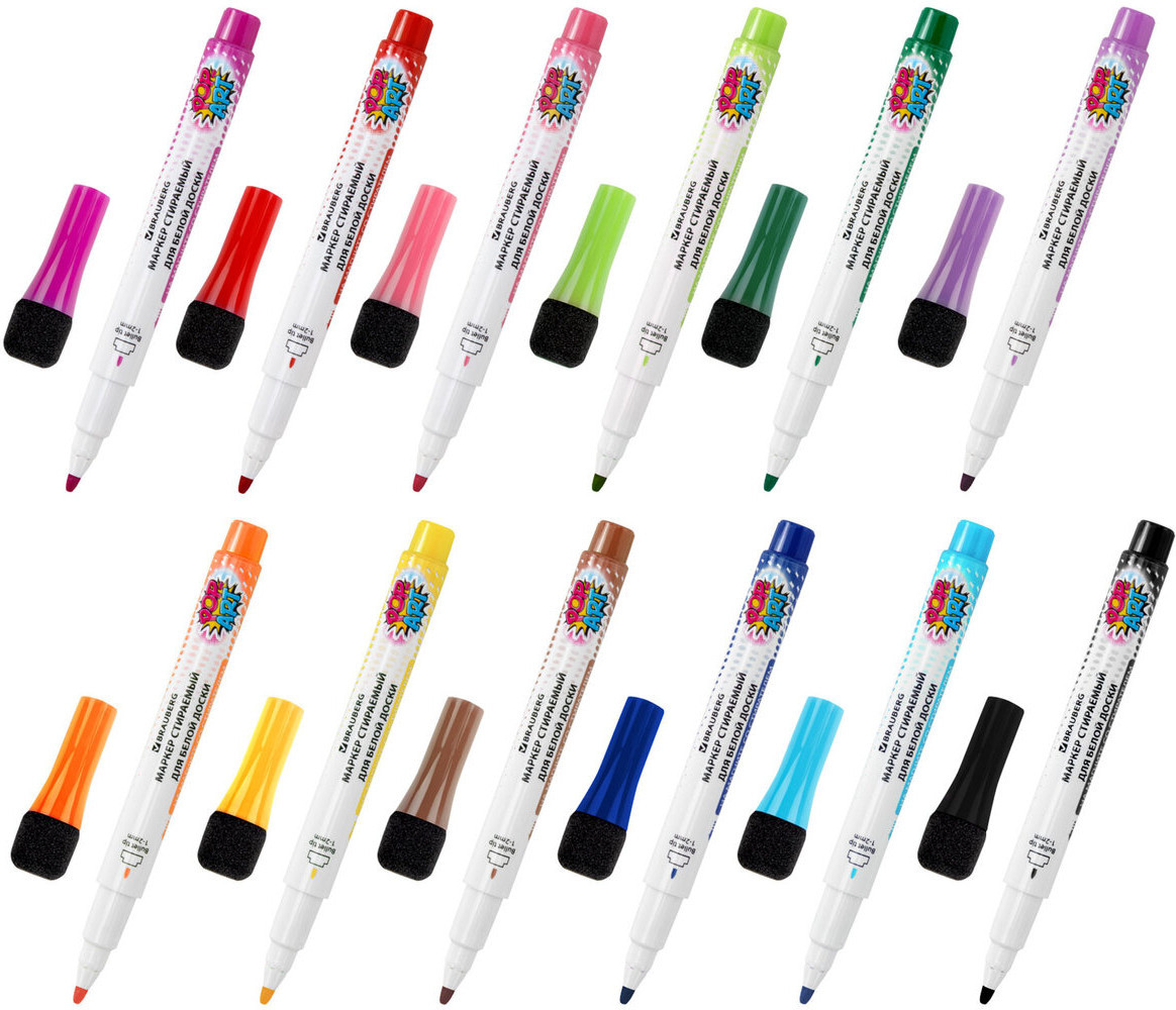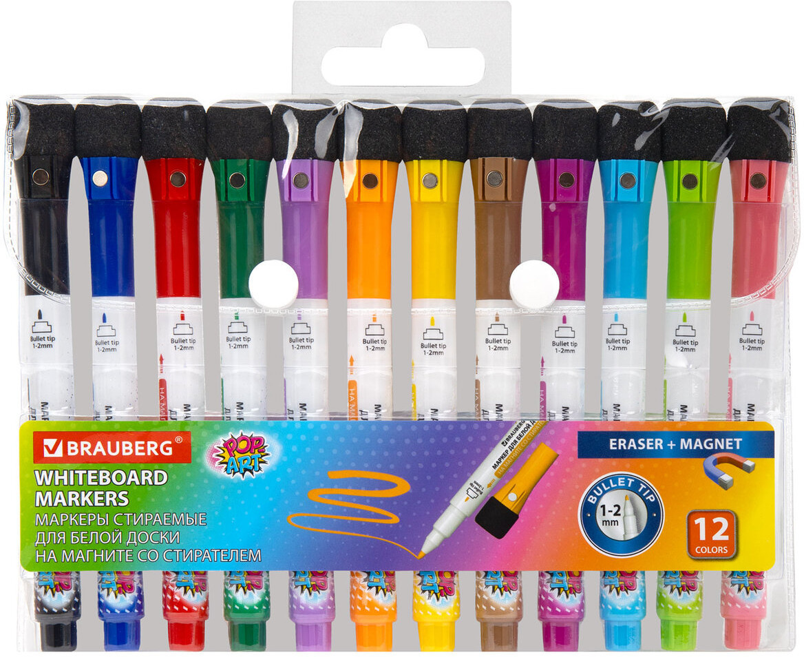 Набор стираемых маркеров для доски и магнитного планера BRAUBERG POP-ART предназначен для использования на изделиях с магнитно-маркерной поверхностью и стекле. Идеально подходит для рисования, игр, визуализации учебных процессов. 12 цветов в наборе: черный, синий, красный, зеленый, сиреневый, оранжевый, желтый, коричневый, фиолетовый, голубой, светло-зеленый, розовый.