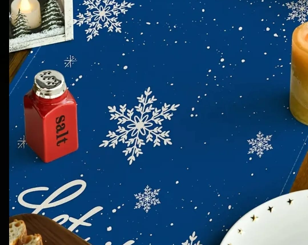 Новогодняя дорожка на стол «Let it Snow» со снеговиком. Добавьте уюта и праздничного настроения в ваш дом с этой яркой дорожкой на стол! На насыщенном синем фоне изображён дружелюбный снеговик в чёрной шляпе с веточками и красной клетчатой шарфом, рядом с ним сидит красный кардинал. Белые снежинки и надпись «Let it Snow» создают атмосферу зимней сказки.
