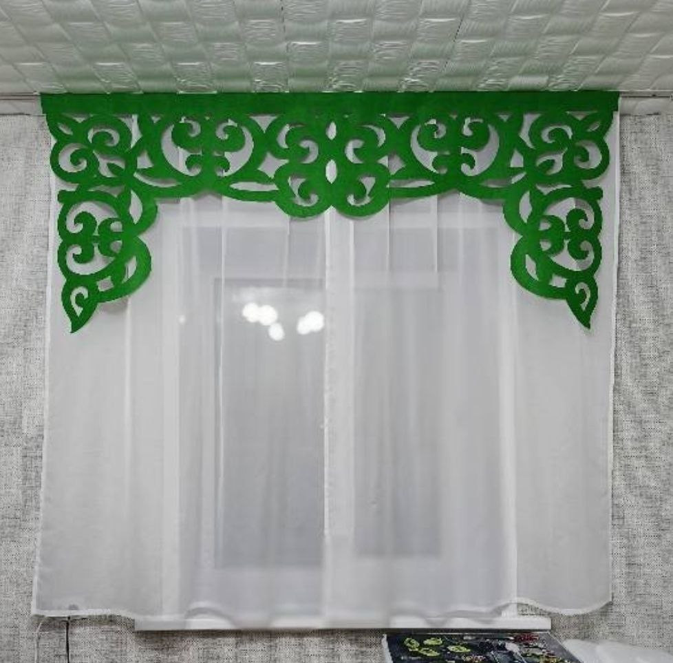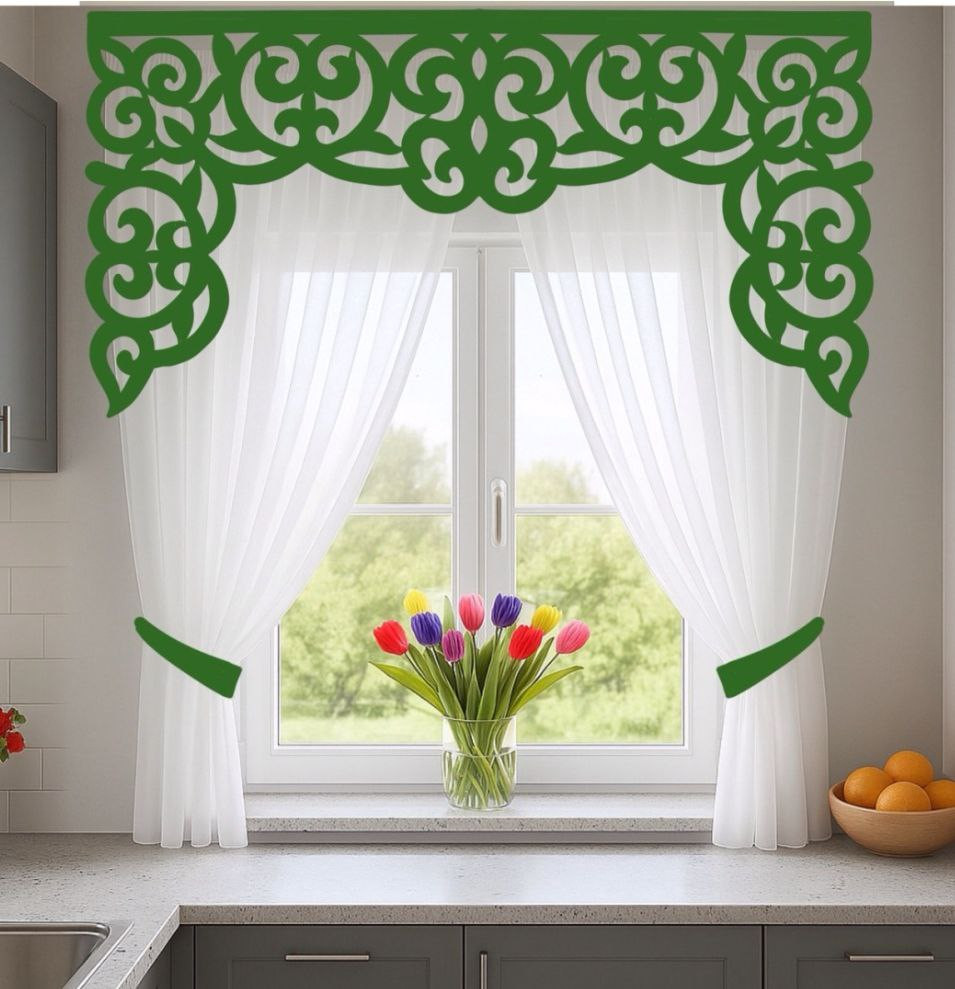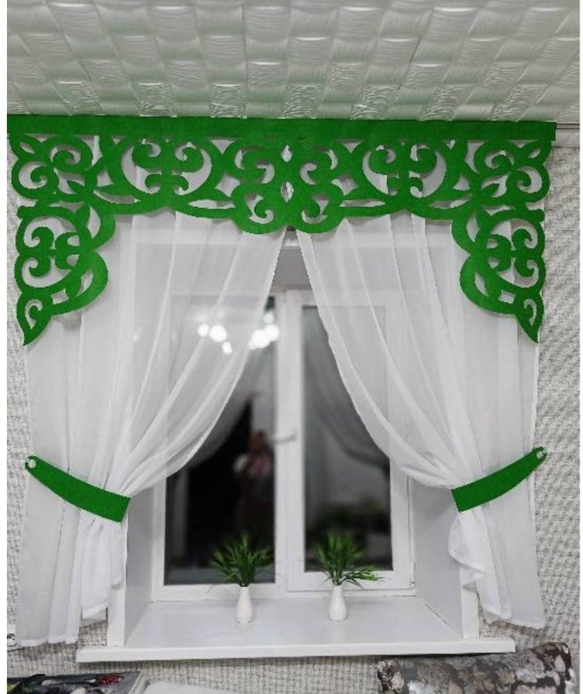Комплект «Сабина» состоит из легкой прозрачной капроновой занавески отличного качества и ламбрекена из фетра ручной работы. Ширина ламбрекена — 2 м (то есть и карниз у вашего окна должен быть длиной 2 метра). Высота занавески — 1,8 м.