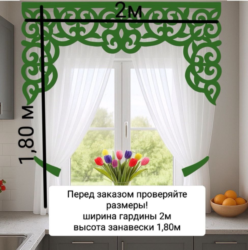 Перед заказом обязательно проверьте эти размеры на своем окне. Подходят ли они вам. Занавеска может быть красиво присобранной по бокам с помощью подхватов в тон ламбрекену (идут в комплекте) или висеть прямо (см.фото). Крепление на крючки (с изнанки занавески и ламбрекена пришита шторная лента для крючков). Для того чтобы ламбрекен сидел четко на месте, не сдвигался во время эксплуатации к комплекту прилагаются стопора для потолочных шин (их фиксируют перед крайними крючками ламбрекена с внутренней стороны), ламбрекен как бы натянут, как на распорках. Именно таким образом сохранится красивый внешний вид, без заломов и складок. Если у вас карниз не потолочная шина, а, например, настенная труба, то ламбрекен также подходит, можно использовать крючки, которые идут с трубой. Навеска занавески не составляет сложности — шторная тесьма стягивается до 2 метров, ставятся крючки. Идеально подходит для кухни или гостиной, добавляя уют и изысканность интерьеру.
