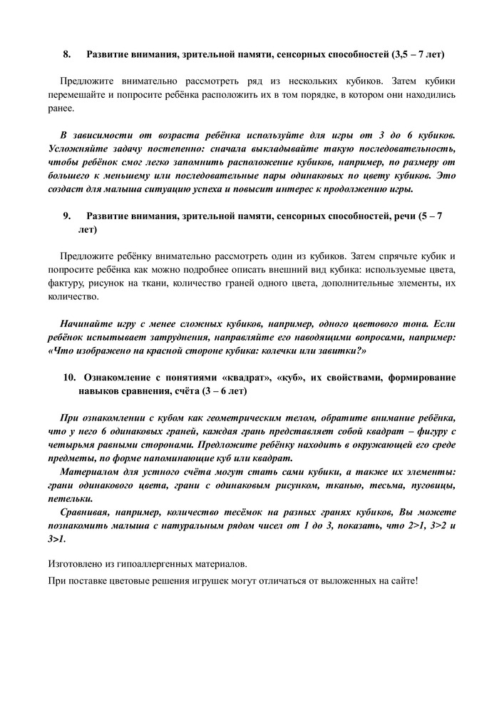 Хорошие кубики, нам понравились и пригодились. Ребёнку 8 месяцев интересно их разглядывать и трогать. Стирала их вручную, вид не испортился после стирки. Пришли кубики не в картонной упаковке как на картинке, а в пакетной упаковке, зато закрытые полностью.