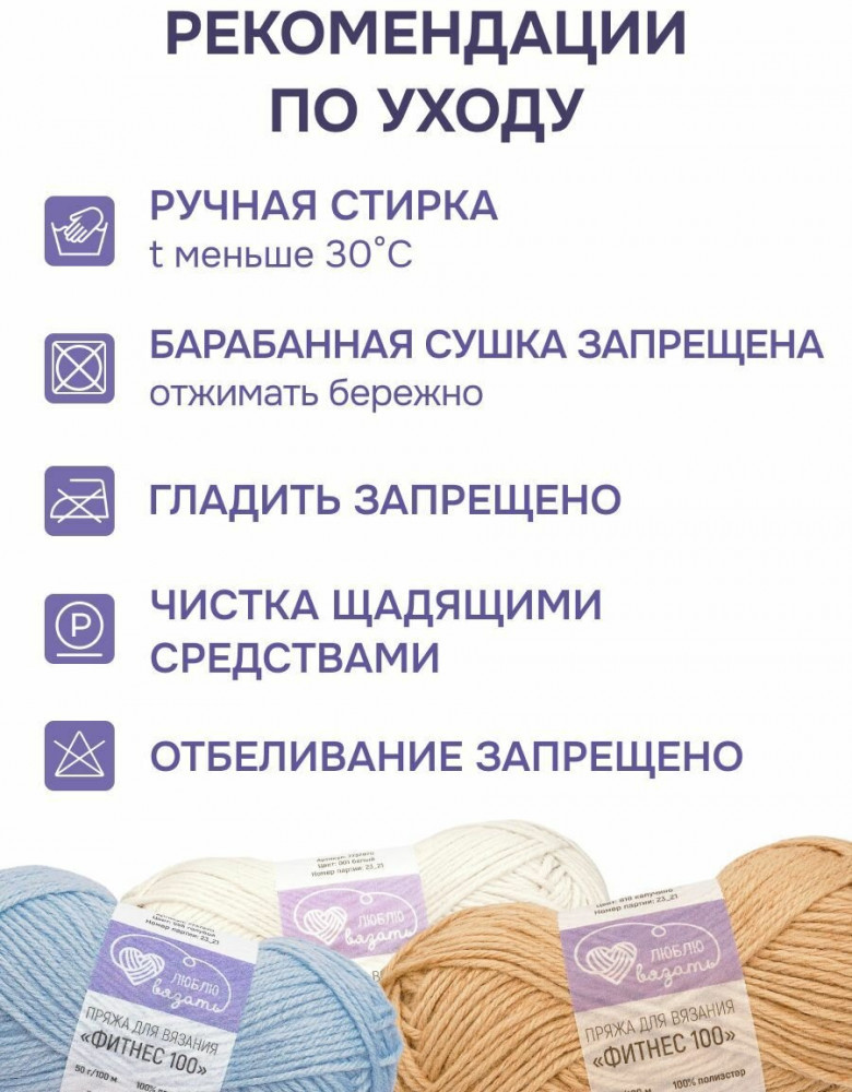 Пряжа «Фитнес» от торговой марки «Люблю вязать» позволяет создавать изделия для тех, кто ведет активный образ жизни. Отличный вариант для стильных и практичных спортивных комплектов, повязок на голову, носков и спортивных сумок. Трикотажные изделия из этой пряжи не сковывают движения и идеально подходят для любого вида спорта, будь то йога или фитнес. Пряжа «Фитнес» состоит из 100% полиэстера. Полиэстер — это синтетическое волокно, известное своей долговечностью. Пряжа очень прочная, мягкая, не вызывает аллергии. Нить классической крутки с небольшим пушком, тактильно имитирует шерстяную пряжу, но не колется и не скатывается. Вяжется легко и не скрипит.