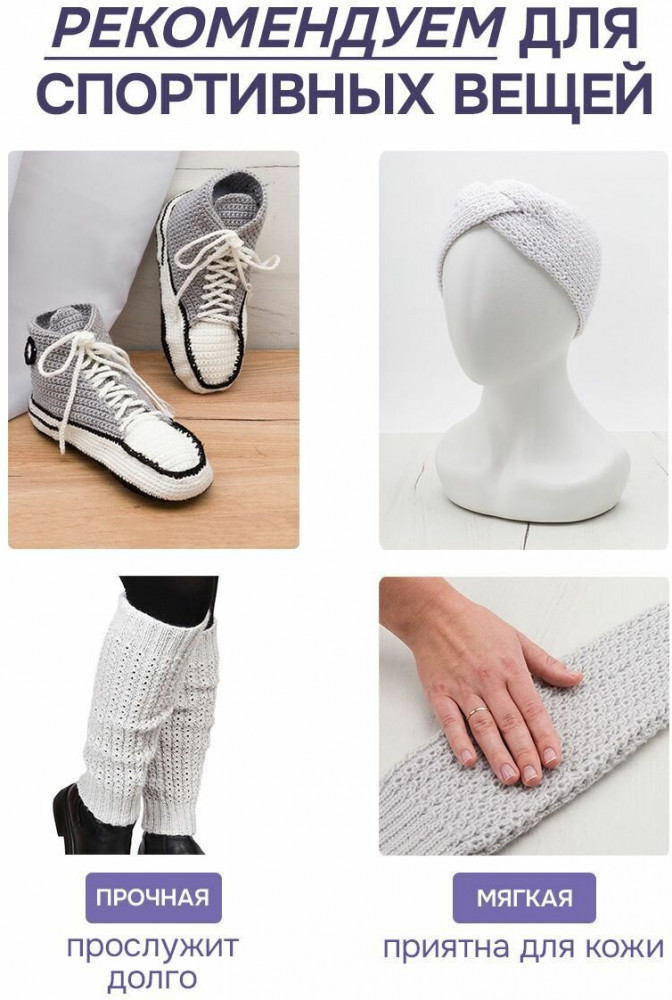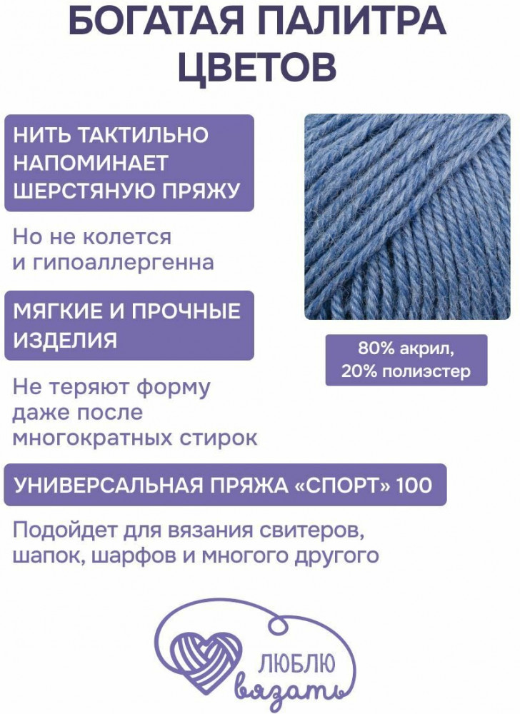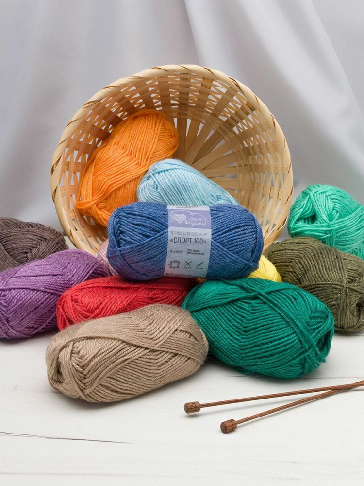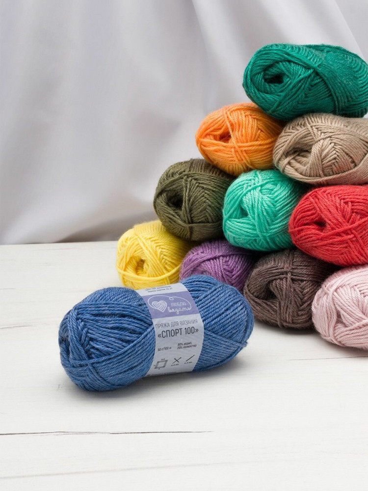 Пряжа «Спорт 100» от бренда Люблю вязать для активных людей, для тех, кто не представляет свою жизнь без спорта и активного образа жизни. Отличный вариант для стильных и практичных спортивных комплектов, свитеров, толстовок, шапок и шарфов. А еще пряжа «Спорт 100» — это идеальный выбор для вязания детских вещей. Пряжа тактильно похожа на шерстяную пряжу, но состоит из современного акрила и полиэстера. Такое сочетание волокон придает пряже мягкость, прочность и не вызывает аллергии. Изделия не растягиваются и не теряют форму даже после многократных стирок. Изделия из этой пряжи быстро сохнут. Богатая палитра матовых цветов позволяет создавать стильные и практичные спортивные комплекты для прогулок и занятия спортом, свитеры, шапки и шарфы, и много другого, так как пряжа универсальная.