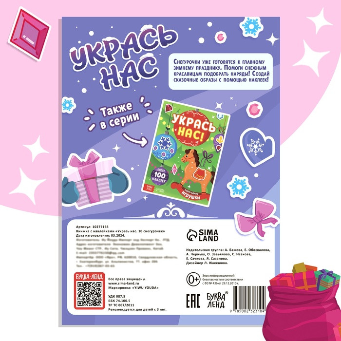 Книжка с наклейками «Укрась нас. 10 снегурочек»новинка В данный момент этот товар отсутствует в продаже. Возможно, у нас найдется аналогичный или похожий товар здесь. Книжка с наклейками «Укрась нас» — это творческое занятие для детей, где каждая страница предлагает создать уникальный образ сказочных помощниц Деда Мороза. Внутри вы найдёте 10 основ для рисунков снегурочек и 64 наклейки с нарядами и аксессуарами. Мягкая обложка делает книгу удобной для использования дома или в дороге. Особенности: 12 страниц с основами для украшения и мини-заданиями, которые стимулируют воображение ребёнка. 64 яркие наклейки можно использовать как в книге, так и для украшения открыток, альбомов или поделок. Простые инструкции и понятные задания делают процесс игры интуитивно понятным даже для малышей. Мягкий переплёт обеспечивает комфортное использование и долговечность издания. |