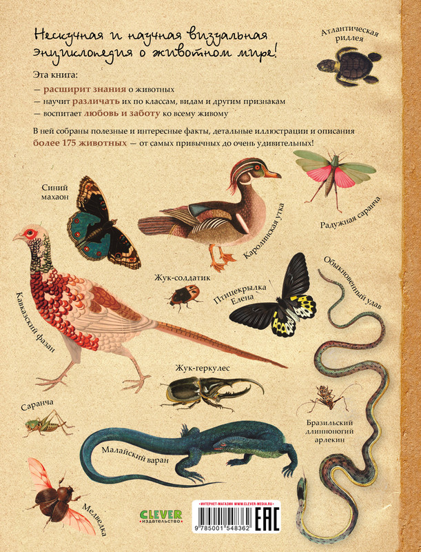 Серия: Удивительные энциклопедии Нескучная и научная визуальная энциклопедия о животном мире! Эта книга расширит знания о животных, научит различать их по классам, видам и другим признакам, воспитает любовь и заботу ко всему живому, станет отличным подарком для Вашего ребенка! В книге собраны полезные и интересные факты, детальные иллюстрации и описания более 175 животных — от самых привычных до очень удивительных. Рыбы-единороги, французский палочник, павлиноглазка Изабелла, суматранский летучий дракон, огненный мухоед, скальный петушок... Эти и другие самые удивительные насекомые, рыбы, рептилии, млекопитающие и птицы ждут на страницах этой красочной зоологии в картинках. Рассматривайте яркие реалистичные иллюстрации, читайте интересные научные факты и узнайте больше о видах, классах и семействах мира животных! |