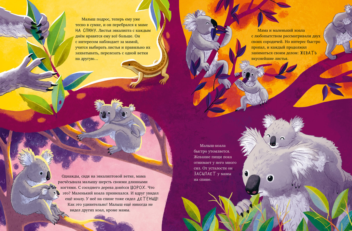 Серия: Удивительные животные «Маленький коала. Приключения в эвкалиптовом лесу» — удивительная книга для детей о рождении и приключениях маленького очаровательного коалы. Он появился на свет, подрос в сумке у мамы на животе и вот уже высовывает любопытную мордочку, знакомится с окружающим миром. Книга с большими реалистичными иллюстрациями расскажет, как малыш-коала учится лазить по деревьям, искать вкусные листочки на обед, убегать и прятаться от хищников. Он узнает яркий мир вокруг! Животные, природа, приключения — идеальное чтение для детей 2-3-4-5 лет! Книжка большого формата с красивыми реалистичными иллюстрациями может стать отличным подарком ребенку, понравится родителям, которые выбирают детские книги о животных, обучающие энциклопедии и книги для детей, развивашки 2 года и познавательные книги для малышей с добрыми историями. |