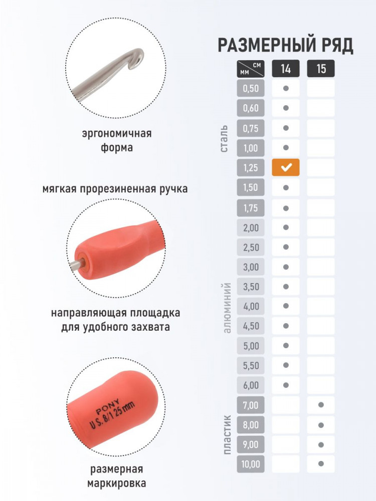 С помощью крючка можно связать эксклюзивный подарок-сувенир, подарить новую жизнь любимым вещам, обновив их красивым ажурным декором, или пополнить свой гардероб стильной и оригинальной обновкой. Крючок для вязания от Pony идеально подходит для создания ажурных вещей из тонкой пряжи: воротничков, легких и воздушных шалей, скатертей и изящных салфеток, а также головных уборов, детской одежды и игрушек амигуруми. Крючок для вязания от Пони станет незаменимым помощником как начинающему любителю вязания, так и опытному профессионалу. Наслаждайтесь процессом вязания и создавайте изделия, которые будут радовать вас и ваших близких долгие годы.
